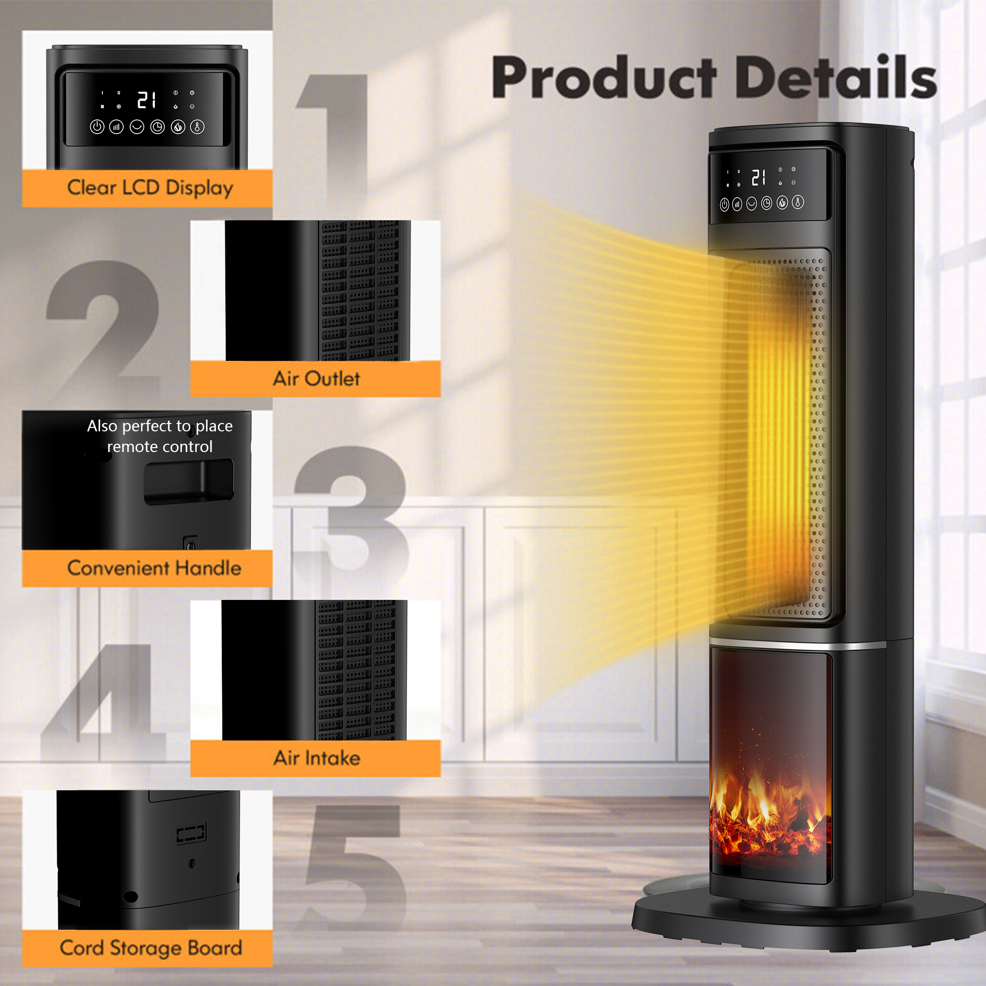 This ceramic tower heater brings quick warmth to your room. It features widespread oscillation to evenly distribute 1500 watts of comforting warmth throughout your space.The adjustable thermostat maintains your desired room temperature. The multi-function remote control operates all the heater functions from a distance. ♥-Exceptionally quiet operation makes the heater perfect for any room ♥-Ideal for full room such as offices, bedrooms and living rooms ♥-High/low/Eco 3 modes to satisfy your needs ♥-Built-in PTC ceramic heating stuff, fast heating ♥-Equipped with a remote control, convenient to adjust indoor-temperature ♥-Design with a timer function from 1-12 hours ♥-Features an overheat and tip-over safety protection for safety ♥-Child lock gives your more safety ♥-Oscillation function to widespread heat ♥-Carry-handle and lightweight design, easy to move
