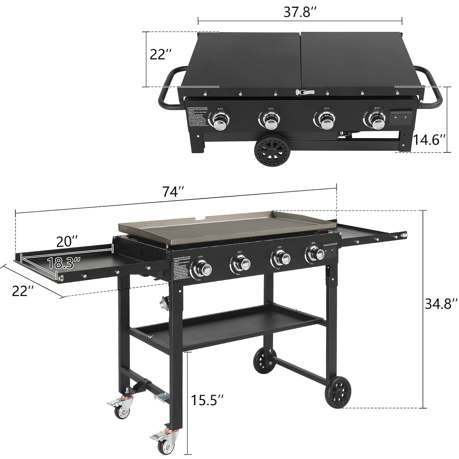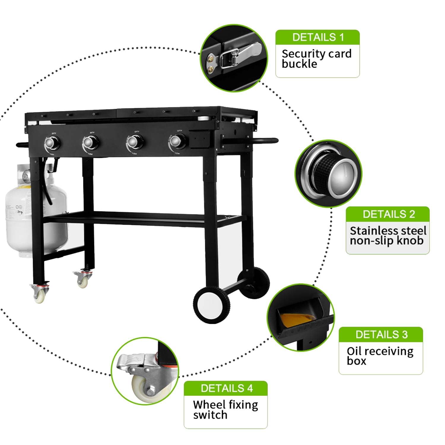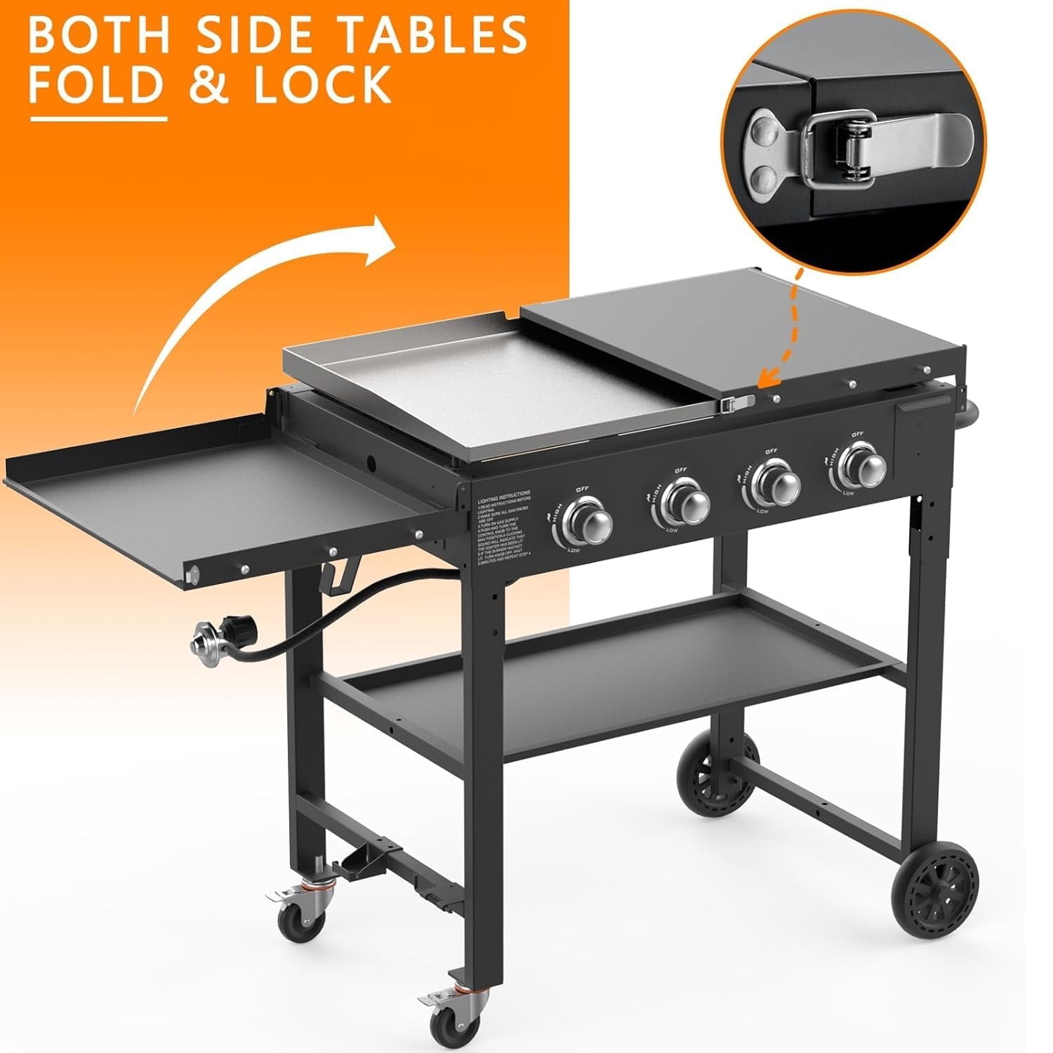 Introducing our 36-inch propane gas grill with 4 burners! Crafted for culinary enthusiasts, it boasts exceptional features designed to elevate your grilling experience. With ample cooking space and four powerful burners, you can effortlessly grill multiple dishes simultaneously, catering to gatherings of any size. Its premium construction ensures durability, while the precision controls allow for optimal heat management, ensuring perfect results every time. Whether you’re searing steaks, grilling vegetables, or smoking ribs, this grill delivers unparalleled performance and flavor. Elevate your outdoor cooking game with our 36-inch propane gas grill and ignite memorable culinary adventures! Specifications: Material: Powder coated steel Burners: 60,000 BTU Cooking area: 720 sq. in 4 independently controlled burners Long-life stainless-steel tube burners Maximum heat output of 60,000 BTUs; 15,000 per burner Handy fold and go design makes the griddle portable for any occasion Four industrial strength, caster wheels (two are lockable) Large 720 sq in cooking area; perfect when cooking for large groups Pre-seasoned griddle for a non-rust finish Griddle top removes easily
