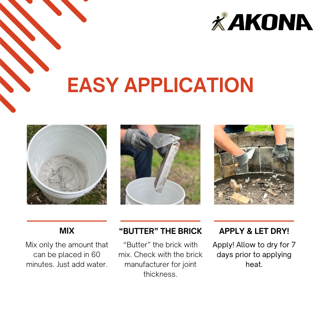 Akona Medium-Duty Refractory Mortar is a dry, preblended mortar ideally suited for setting masonry units in fireplaces (outdoor or indoor), fire pits, BBQs, or chimney applications such as setting clay flue liners. Our refractory mortar is air-entrained for freeze-thaw resistance, offers great workability, high strength, and a one-hour working time. Good for temperatures up to 2,550°F and has passed ASTM C199, ASTM C1283, and ASTM E136. This 25-pound model is ideal for smaller jobs and those needing an easier handling container. Model number: 114266 (25 lb.) Quantity: 1 Multipack Quantity: 1