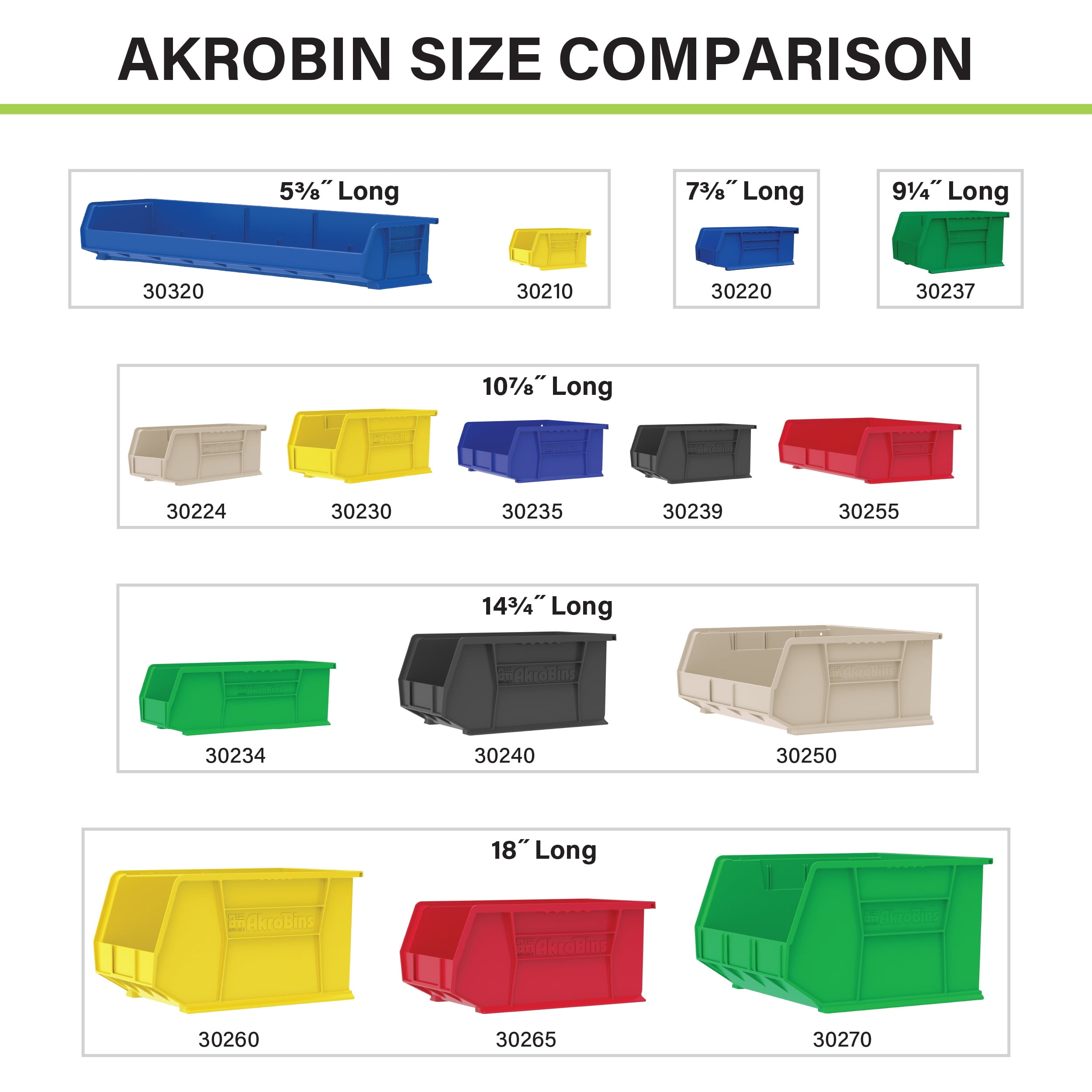 Do you need some extra storage space? Heavy-duty AkroBins help you organize everything from a workbench in a one car garage to a warehouse full of parts. Use our stacking bins for any job large or small! Turn your messy space into an organized, efficient work area. These plastic organizer bins can be stacked to make the most of your space while still keeping everything accessible. You can also hang our storage bins on Akro-Mils louvered panels or rails to free up work desk or shelf space. Perfect for classrooms, play areas, garages, or any other area that needs extra storage. All Akro-Mils products are Made in the USA. Stay organized with the Akro-Mils Stackable Storage Bins! Choose a set of stacking bins that you can count on! These heavy duty storage bins are made with a one-piece, industrial-strength plastic construction and are rust, water and corrosion-proof. You can count on them to last for the long term. AkroBins are available in a variety of sizes. The smaller ones can be used to keep screws, craft supplies, small toys, candy or snacks, while the largest ones are great for holding sporting equipment and garage items! Our storage bins are great for organizing classrooms, your workshop, and play areas. Started in 1946, Akro-Mils has provided high quality storage and material handling solutions for over 75 years. Our products are manufactured under rigorous standards and are quality tested to ensure they continuously meet your performance expectations When you need screw organizers and storage bins, we’re the brand to trust. Add the Akro-Mils Stackable Storage Bins to your cart today!