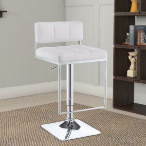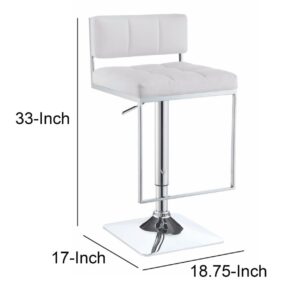 Adjustable Modern Metal Bar Stool, White & Silver- Saltoro Sherpi Adjust this bar stool to the perfect height for your counter or table. The modern stool features an angular motif with a low rectangular back, a wide seat with square corners, and a hanging footrest dropping from the base of the seat. The chair is plushily upholstered and finished in white leatherette. The base is finished in stunning chrome ( silver).