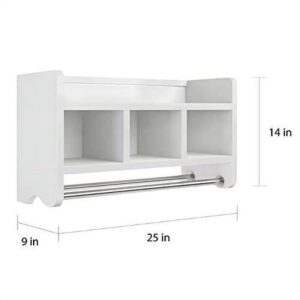 25″ wide bathroom shelf with shelf, cubbies and towel bar. Coordinates with the Alaterre Bath Vanity Furniture collection. Each cubbie measures: 7″ W x 9″ D x 5″ H, Shelf dimensions: 25″ W x 9″ D x 3″ H, Each rod: 0.75″ diameter Storage cubbies to decorate or store useful bath items Two towel bars Coordinates with the Alaterre Bath Furniture collection or with your own décor. Hanging hardware included.