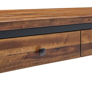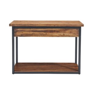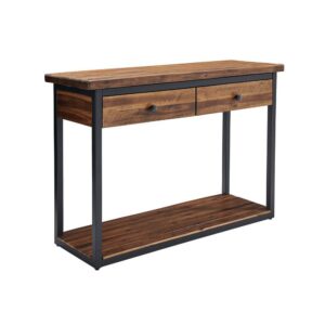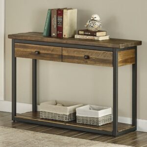 This Alaterre Claremont 43″L Rustic Wood Console Table with Two Drawers and Low Shelf in our Claremont Collection features highlights of rustic wood and metal provides unpolished elegance to your space. With functional drawers and a low shelf each piece is uniquely yours. Knots, cracks and even rough-hewn edges showcase the wood’s original qualities. Our lacquer finish with light and dark tones allows for the wood’s natural grain to show through. This collection will make a statement in your living space.