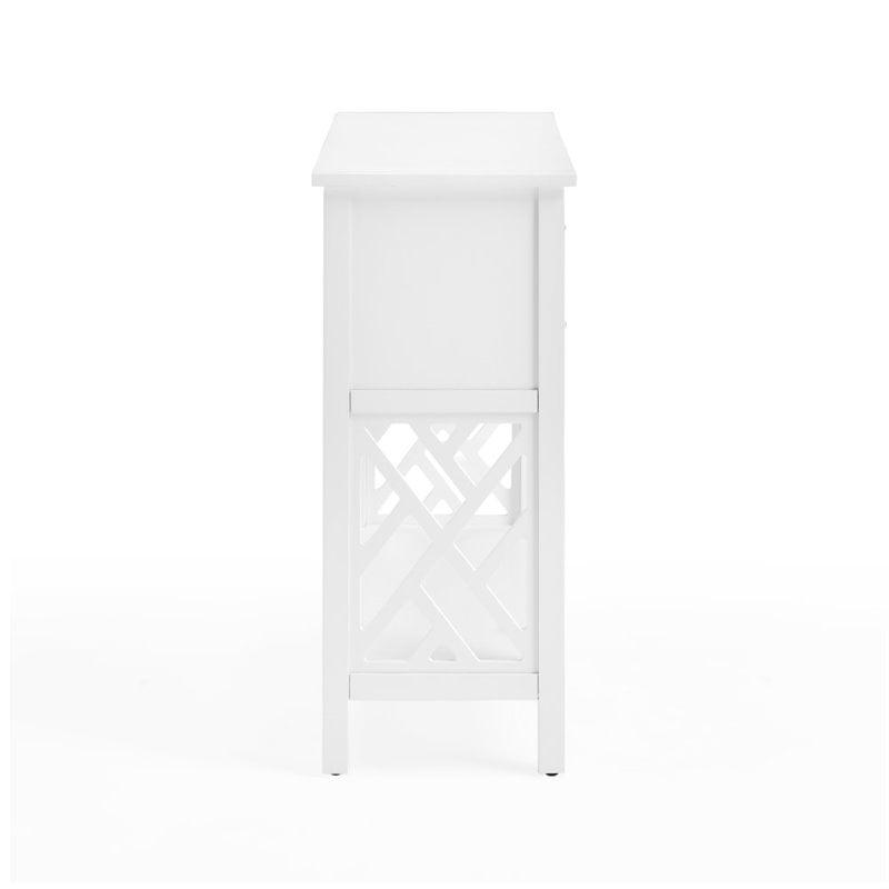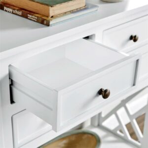 Alaterre Coventry 32″W Wood Console Table with 4-Drawers is a fresh, clean collection that is versatile in any space. The open-detailing on each side is airy and offers a unique look for your décor. This collection works in a range of decorating styles- from traditional to modern with its clean lines and decorative side-element. Versatile console/storage table can be used in living room, entryway or even the kitchen. Perfect accent for any space and coordinates effortlessly with many decorating styles.