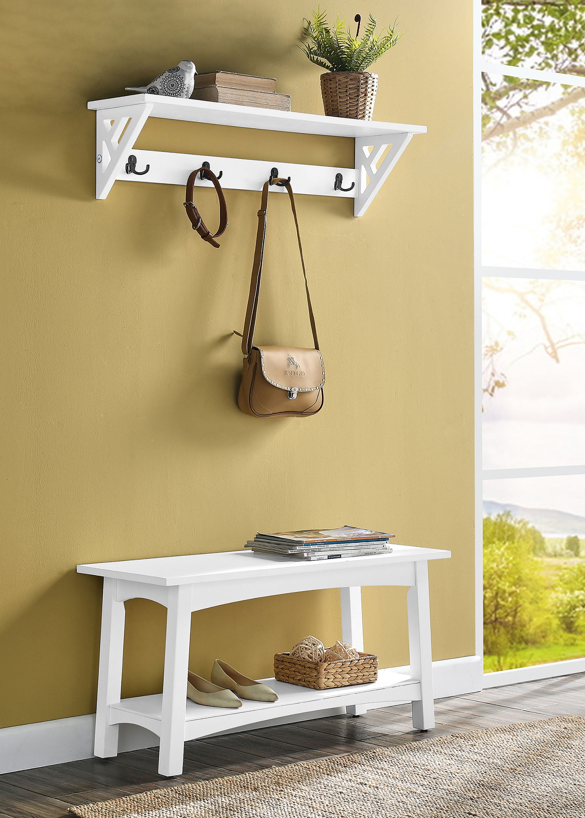 [ORGANIZATION MADE SIMPLE] This set is designed to keep any entryway or mudroom looking neat and orderly. With four double coat hooks, you can organize your coats, hats, scarves, and more in one convenient place [QUALITY CONSTRUCTION] This collection is made from high quality materials and features a contemporary style with its clean lines and decorative side-elements. Easy to assemble without the use of power tools [COMPACT DESIGN] This hall tree set has a shelf with dimensions of 36″W x 9″D and is perfectly suited for small entryways, mudrooms, and laundry rooms. This set works in both traditional and modern decorating styles [SPACE-SAVING ELEGANCE] Enhance your home’s entryway with the Alaterre Furniture Coventry Hall Tree Set; featuring a 36″ W bench and coat hook unit that blends traditional charm with modern utility; perfect for organizing essentials [HIGH QUALITY] Made of durable material, you can easily rely on this 36″W Coat Hook with Shelf to provide a neat, organized, and modern design to your home’s entryway, mudroom or laundry room