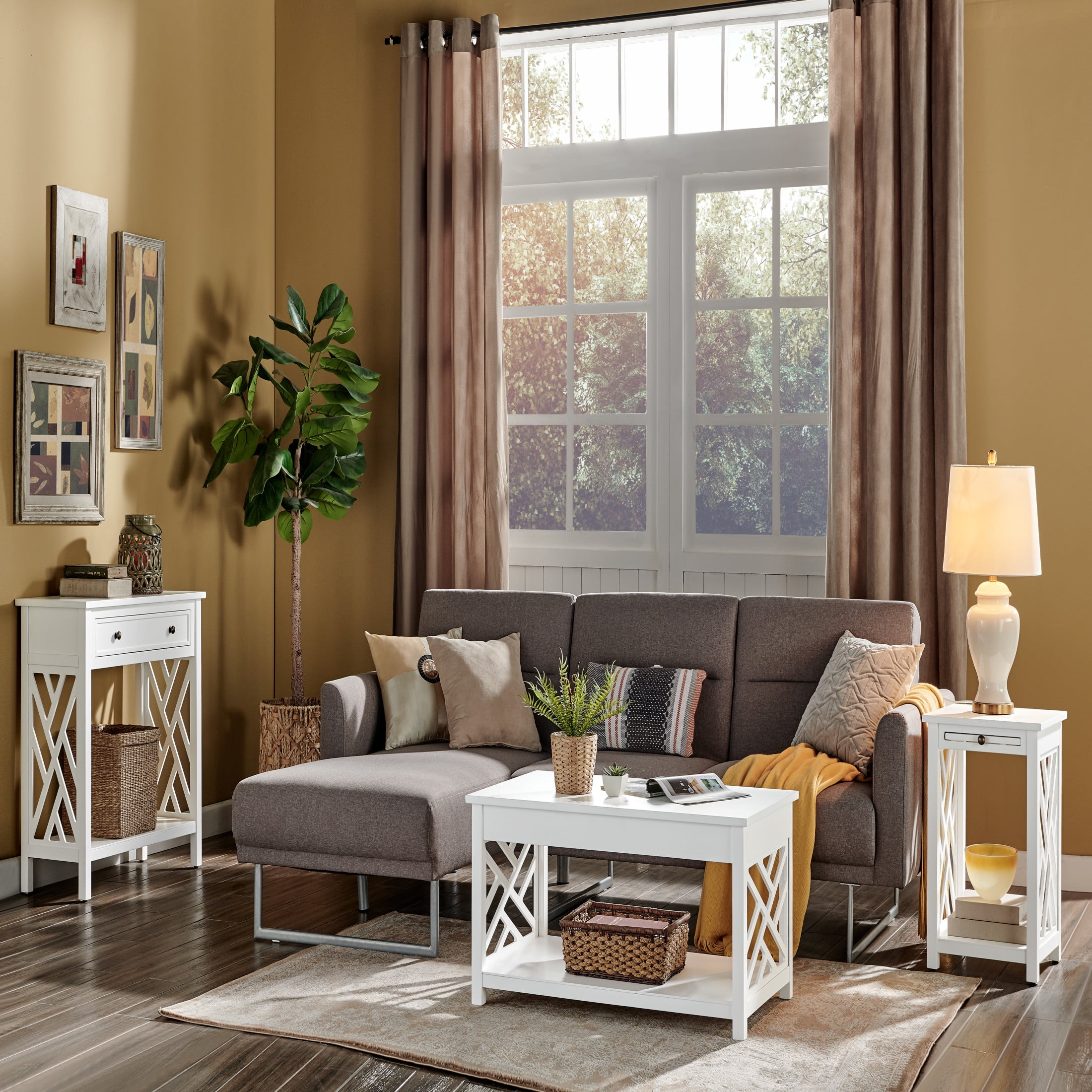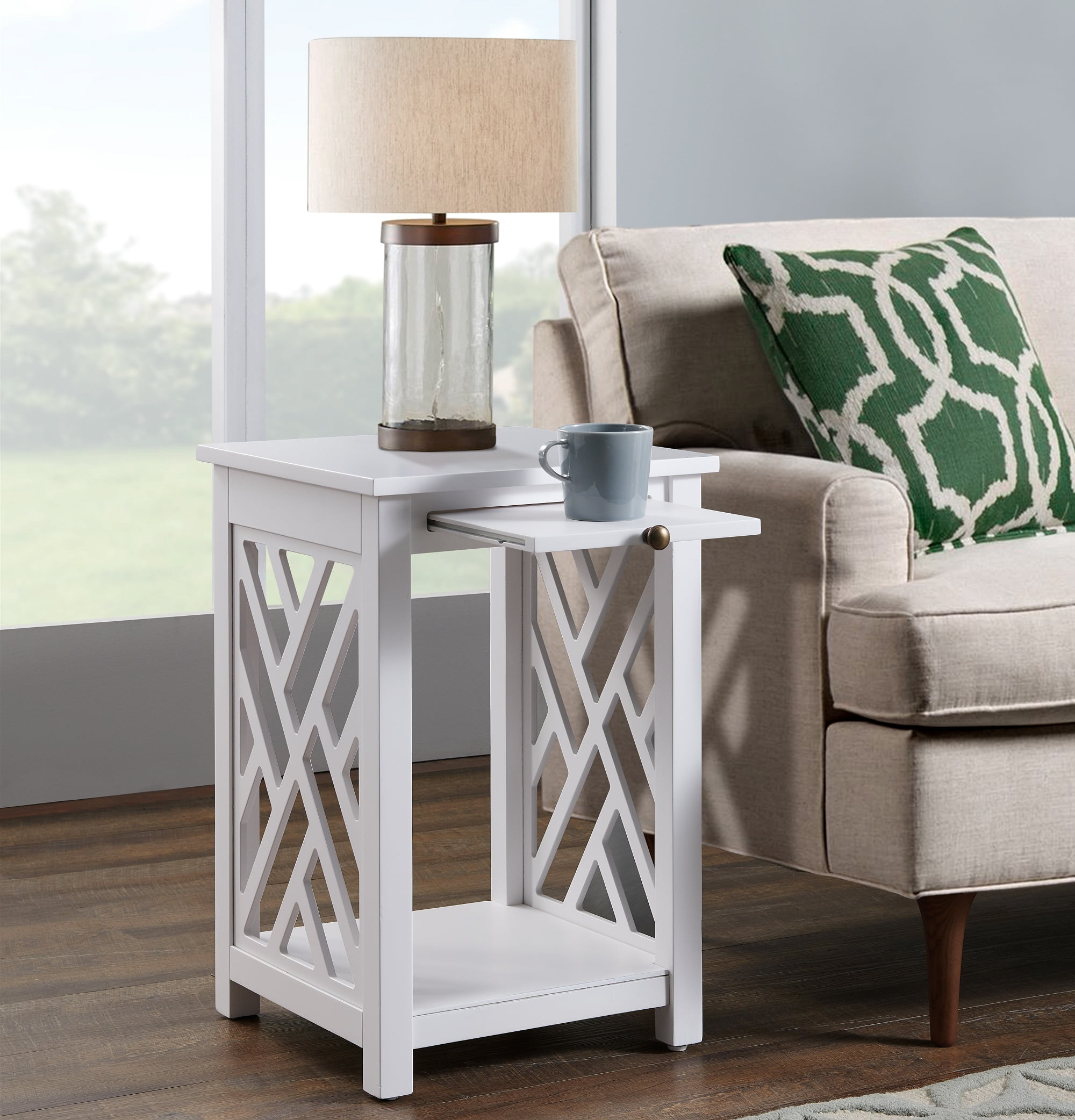 [PROVIDE USEFUL STORAGE] Coventry End Table with tray shelf and bottom shelf offers ample storage for books, remotes, and magazines, keeping your living space organized [CREATE LOVINGLY CRAFTED AESTHETIC] Open detailing adds an airy feel, making this accent furniture piece an ideal addition to traditional, cottage, or modern loft decor, enhancing any home setting [ROBUST BUILT QUALITY] Crafted from premium-aged wood and reinforced with superior construction, this end table is made to last you for years to come. The wide bottom shelf and pull-out tray shelf offer extra stability for heavier home decor items [MAXIMIZE YOUR SPACE] Ideal for small apartments, this Alaterre Furniture Coventry Wood Accent Tray Table features a compact design with a pull-out tray and spacious lower shelf; enhances any living room with its simple white finish [EASY TO ASSEMBLE] Easily assemble with the helpful step-by-step instructions sheet. Please be aware that during assembly, you must use manual tools for screws and bolts, as power tools may damage the wood finish
