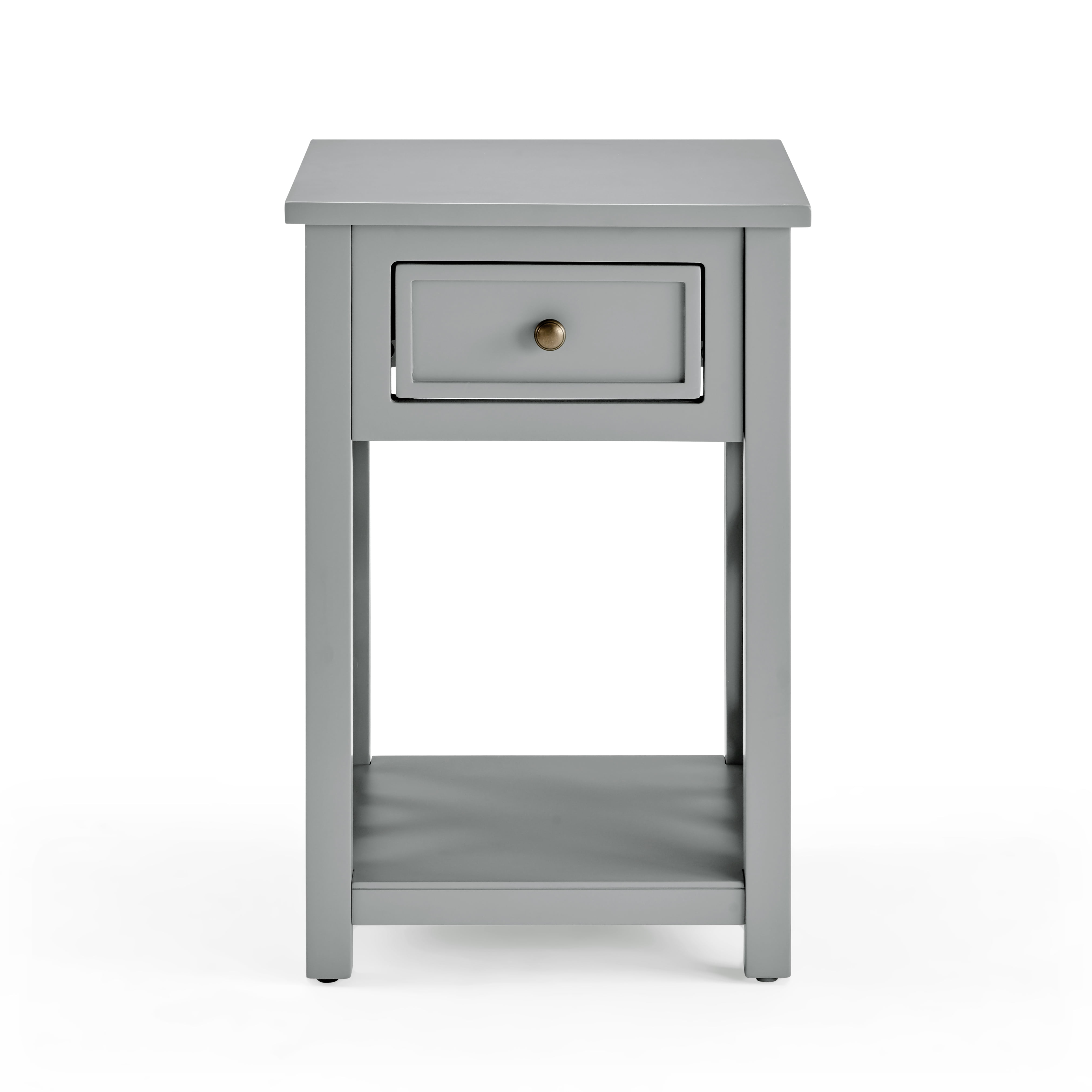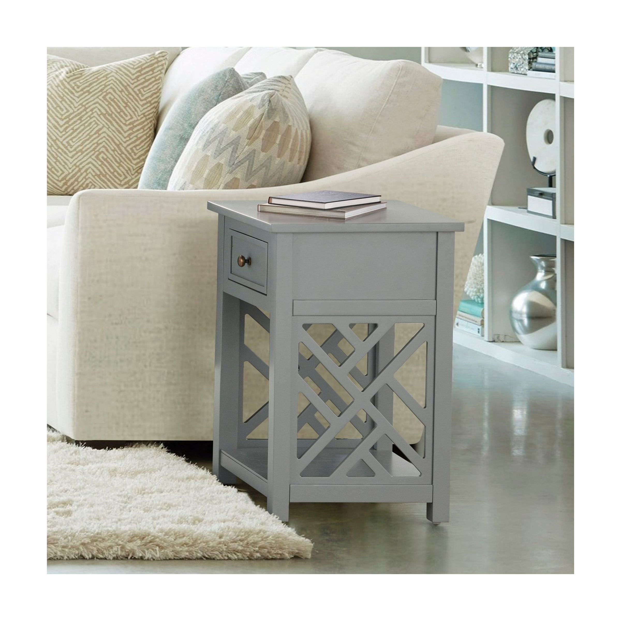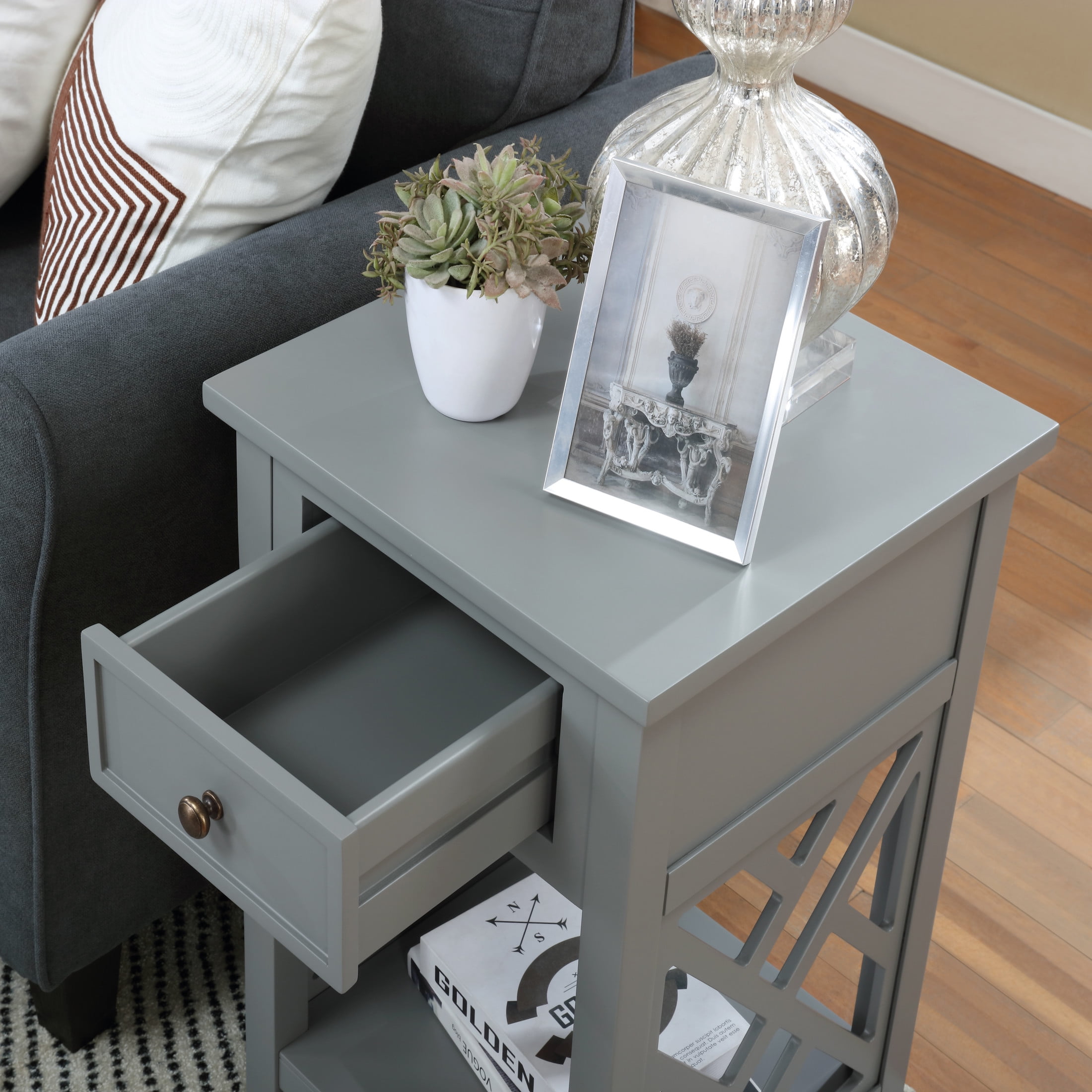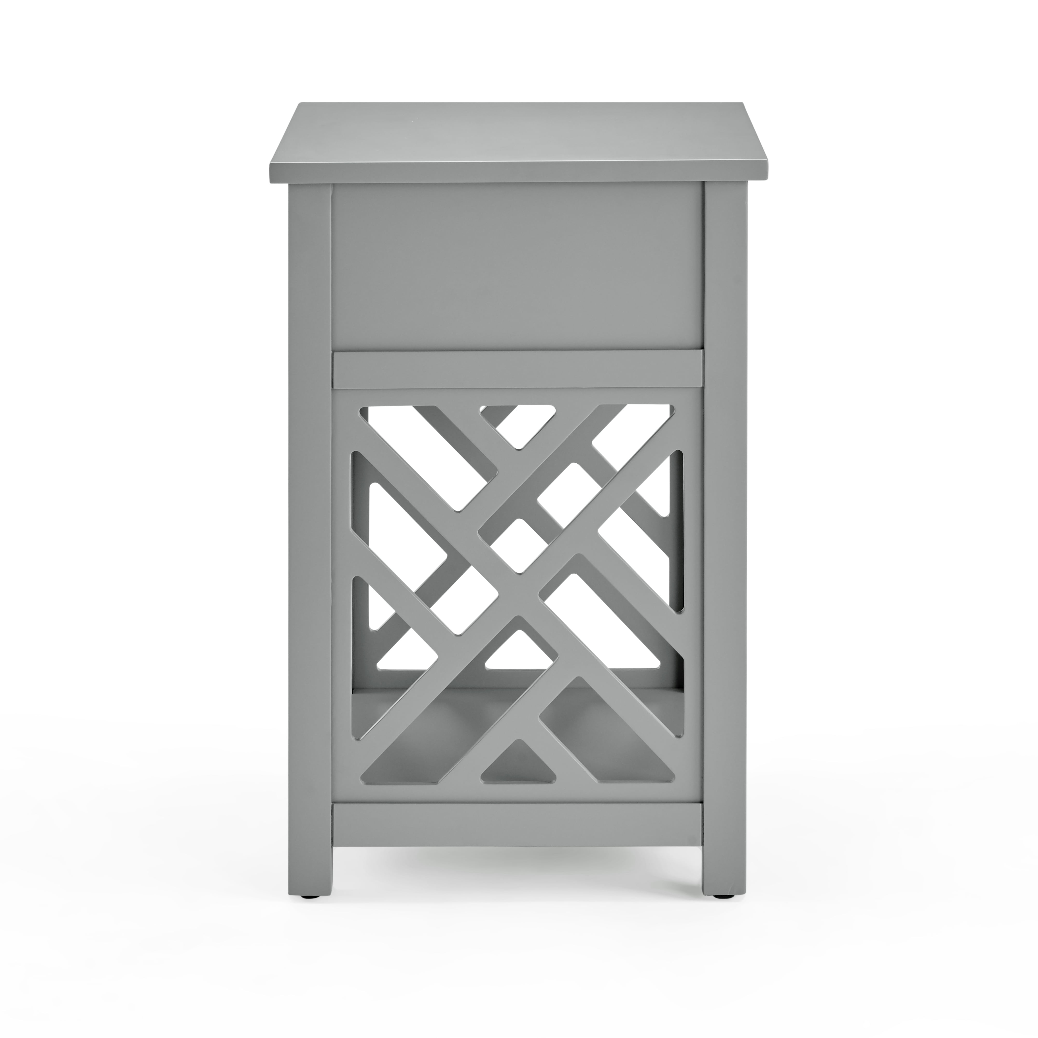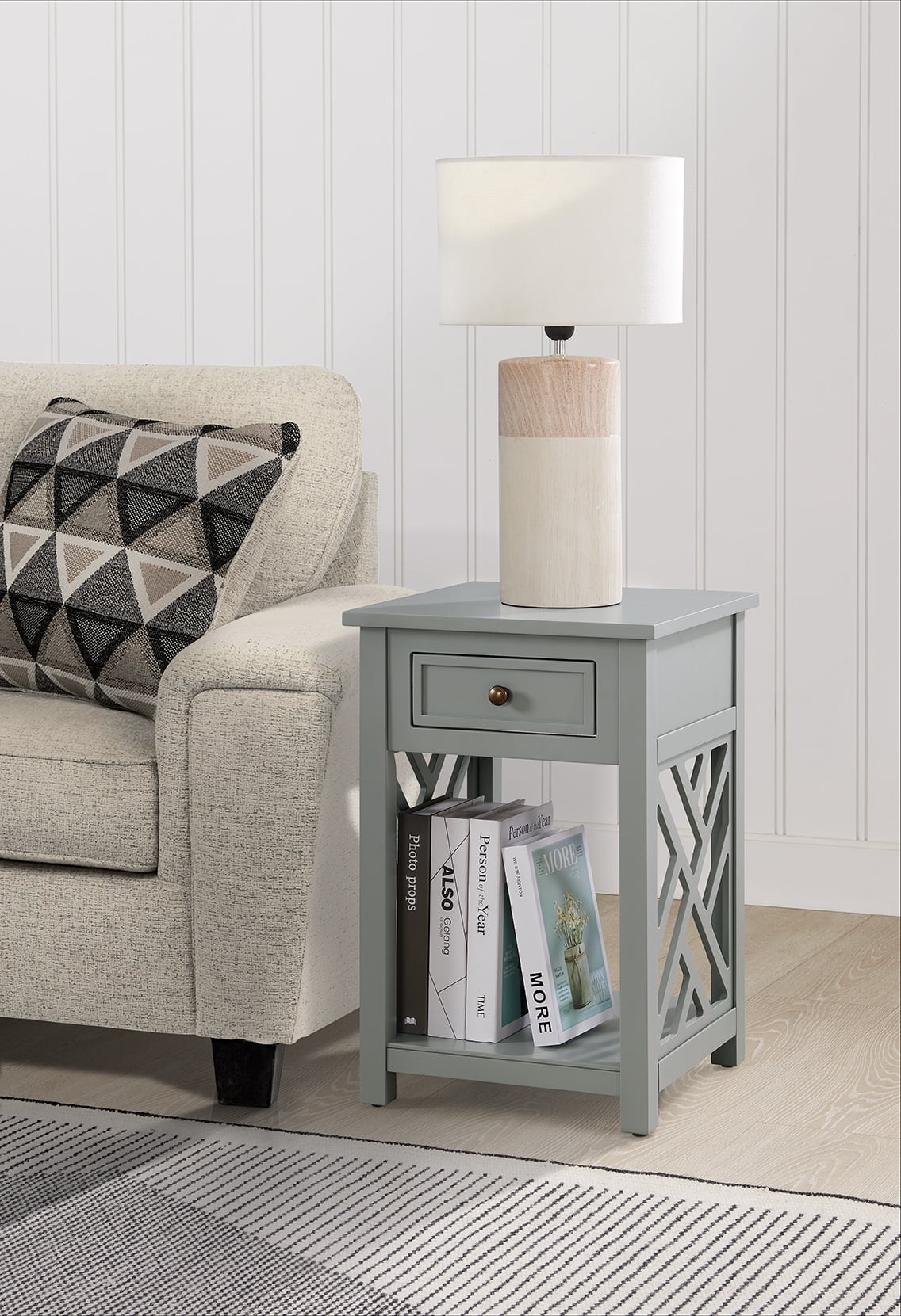 [STYLISH & MULTI-PURPOSE] Coventry End Table offers a drawer and shelf with open detailing, adding modern design and extra storage to any room [COMPACT SIZE] At just 15.8L x 15.8W x 23.8H inches this end table fits perfectly into in smaller spaces. It’s the perfect solution for apartments, condos, dorms, and other small rooms [VERSATILE DESIGN] This end table is suitable for both classic and modern decor, offering a unique design with its square pattern and open-detailing side elements [FUNCTIONAL ELEGANCE] Enhance your living space with the Alaterre Furniture Coventry Gray Wood End Table; perfect for apartments, this piece combines functionality with aesthetic appeal, featuring a smooth gray finish and ample storage [EASY ASSEMBLY] This quality furniture comes with easy to understand assembly instructions and hardware for a quick and painless set-up] so you can enjoy a designer-look accent table in no time