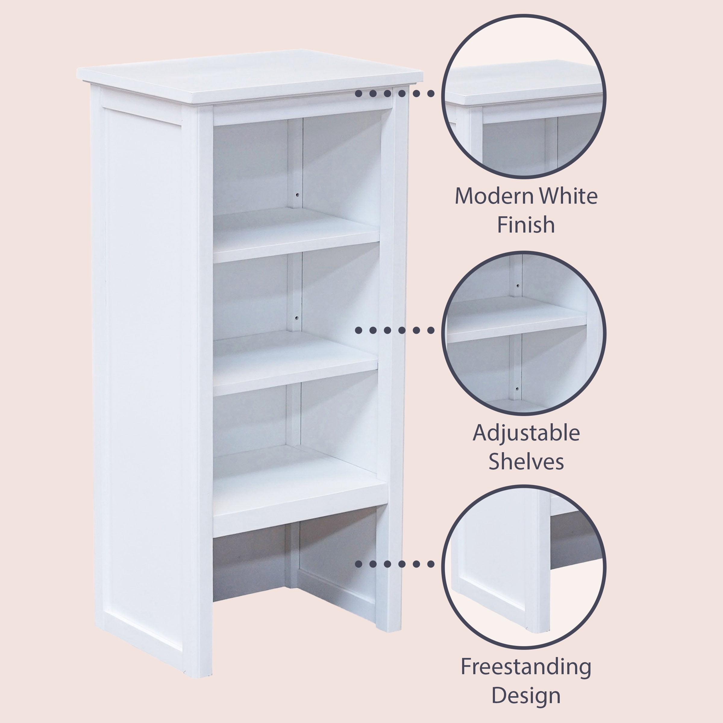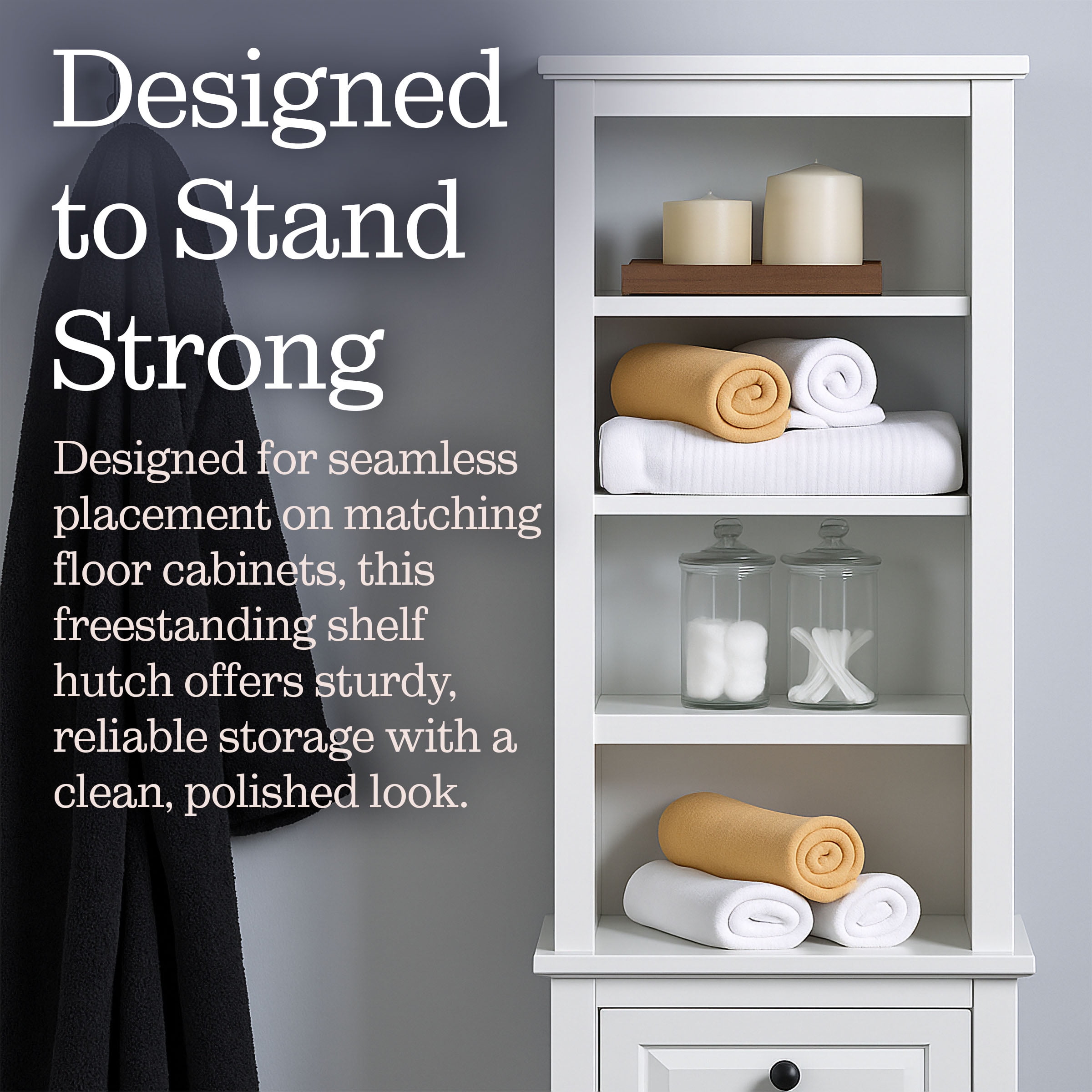 Stand alone hutch with open shelving or use it with coordinating collection floor cabinets. •13″ deep shelving hutch with adjustable shelves •Easy to assemble with all hardware included. •Does not include hanging hardware; hutch does not hang on the wall. •Pairs with floor storage cabinets from this collection. •Clean with a non-abrasive cloth using a mild soap; wipe dry. • • • •Shelf capacity: 75lbs. If installed properly