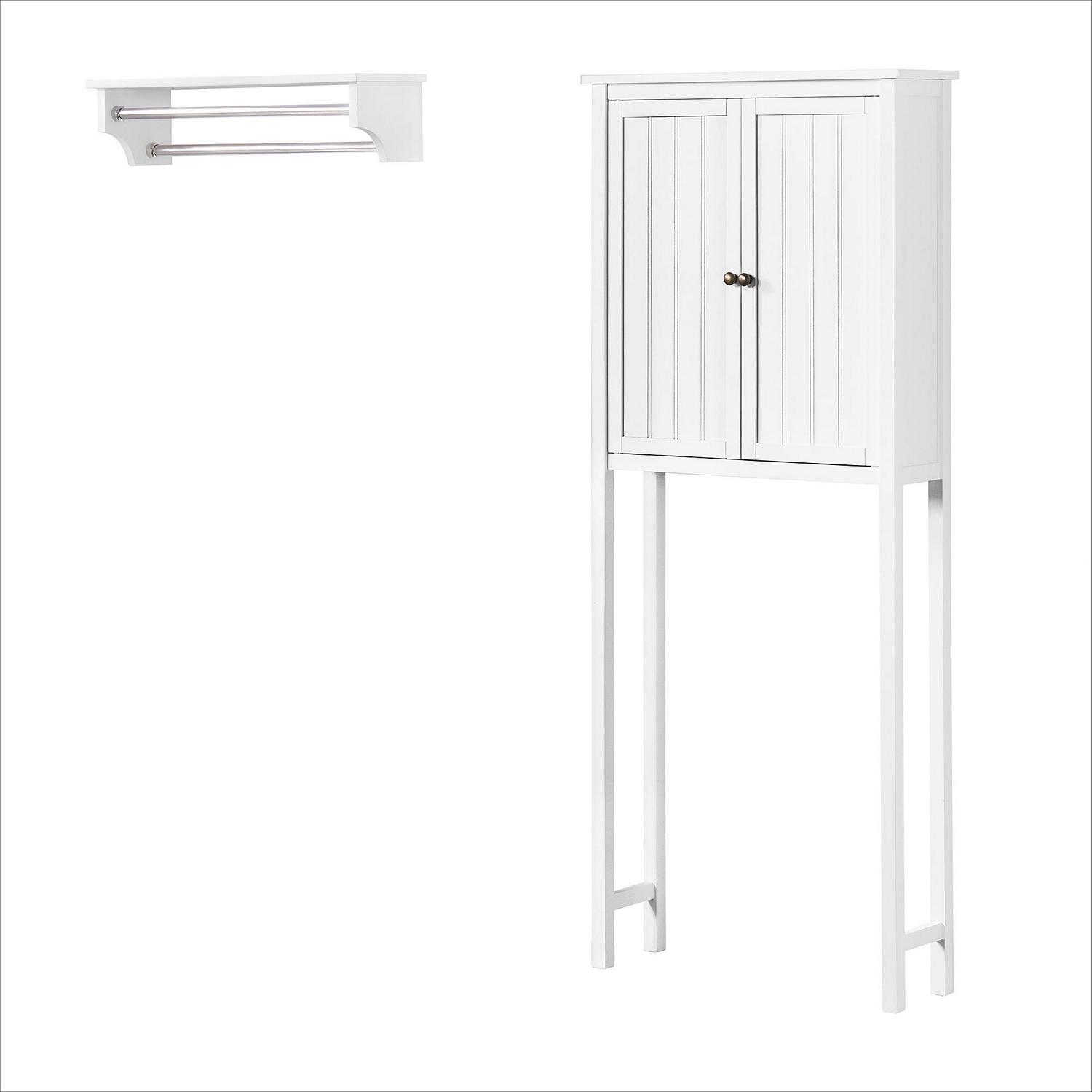 This collection brings space saving storage to your bathroom. The classic design compliments almost any bathroom décor. Wood construction with a white, painted finish, these pieces are designed for both style and functionality. A perfect space saver for your bathroom; over the toilet space saver hutch allows you to tuck away your toiletries behind two doors. The cabinet design offers ample storage. The cabinet features two adjustable shelves that are ideal for storing items of different sizes. The 27″W shelf provides space for decor or bathroom accessories and features two towel rods. Bath collection is moisture resistant.