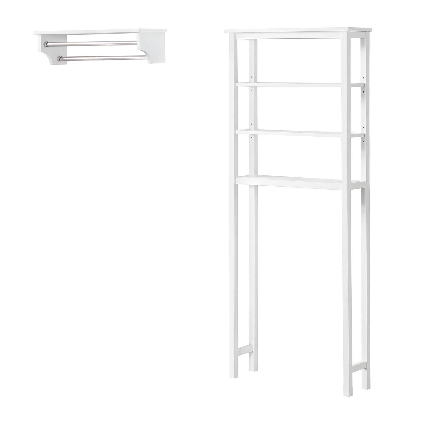 This collection brings space saving storage to your bathroom. The classic design compliments almost any bathroom décor. Wood construction with a white, painted finish, these pieces are designed for both style and functionality. A perfect space saver for your bathroom; over the toilet space saver organizer features three open shelves with plenty of space to keep toiletries, folded towels and decorative accessories. The 27″W shelf provides space for decor or bathroom accessories and features two towel rods. Bath collection is moisture resistant.
