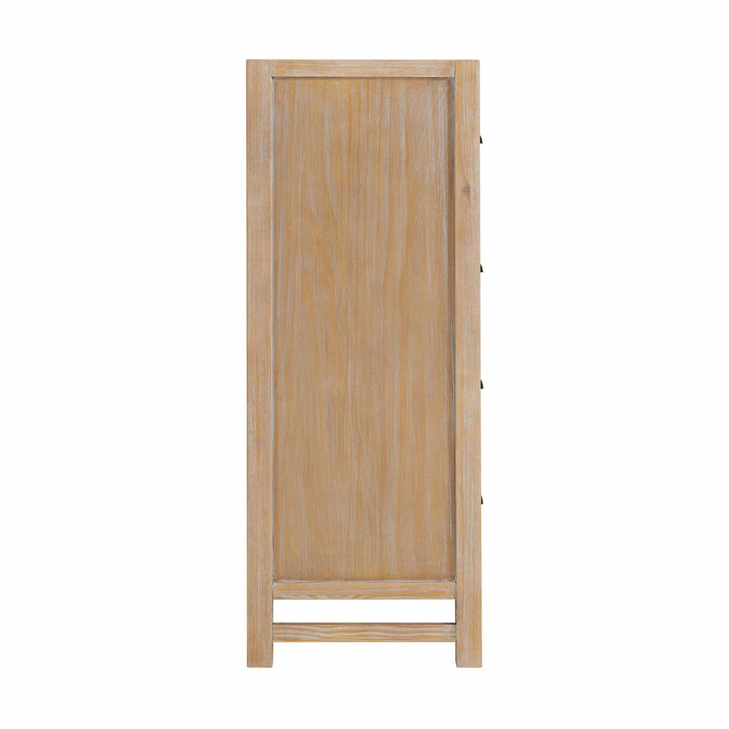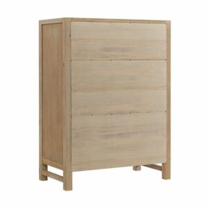 Simple yet striking, this bedroom collection transforms your space into an inviting haven. This 5-drawer chest is ideal provides ample storage for your clothes, blankets, and accessories. The versatile style complements a wide array of styles ranging from modern rustic to a boho retreat. Made of solid pine wood. These pieces are well constructed, durable, and will last for years to come. The light driftwood finish highlights tonal variations, grain and marks that are unique to each piece. Assembly required.