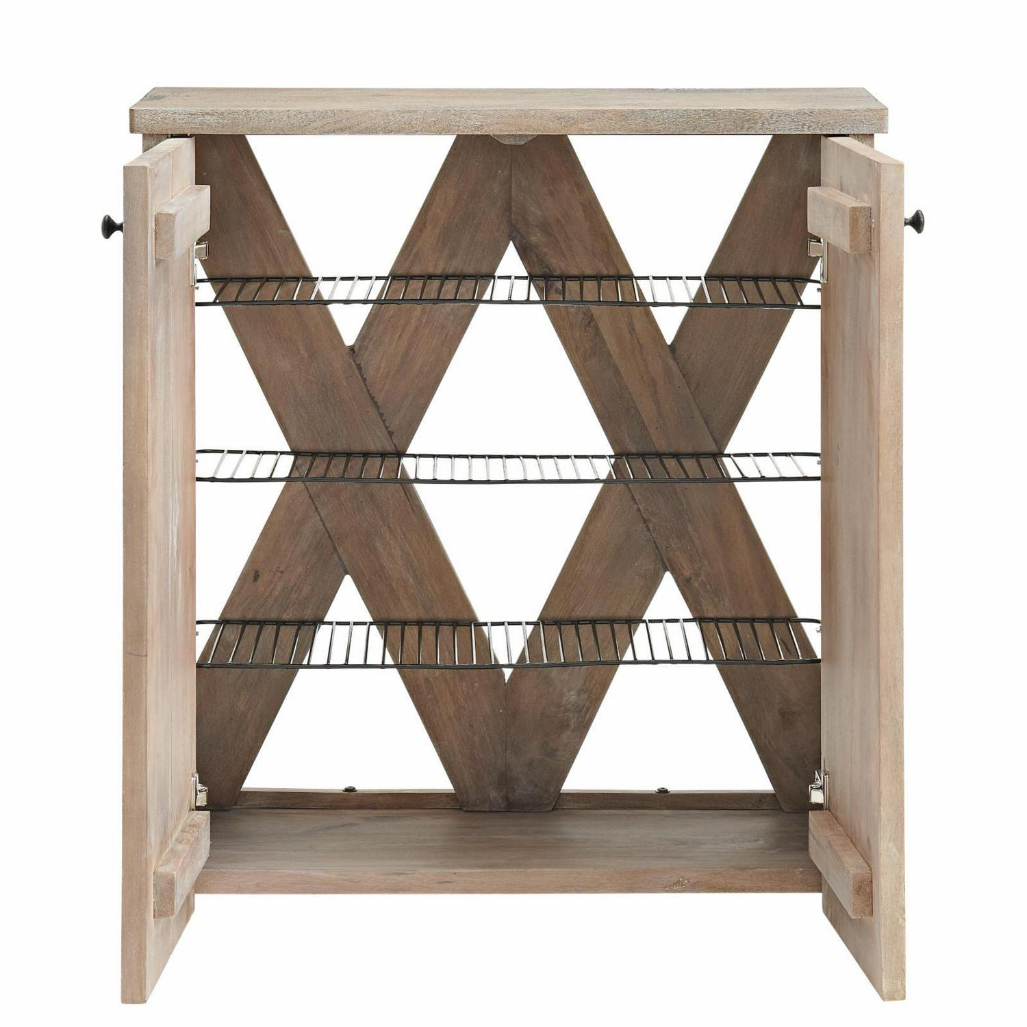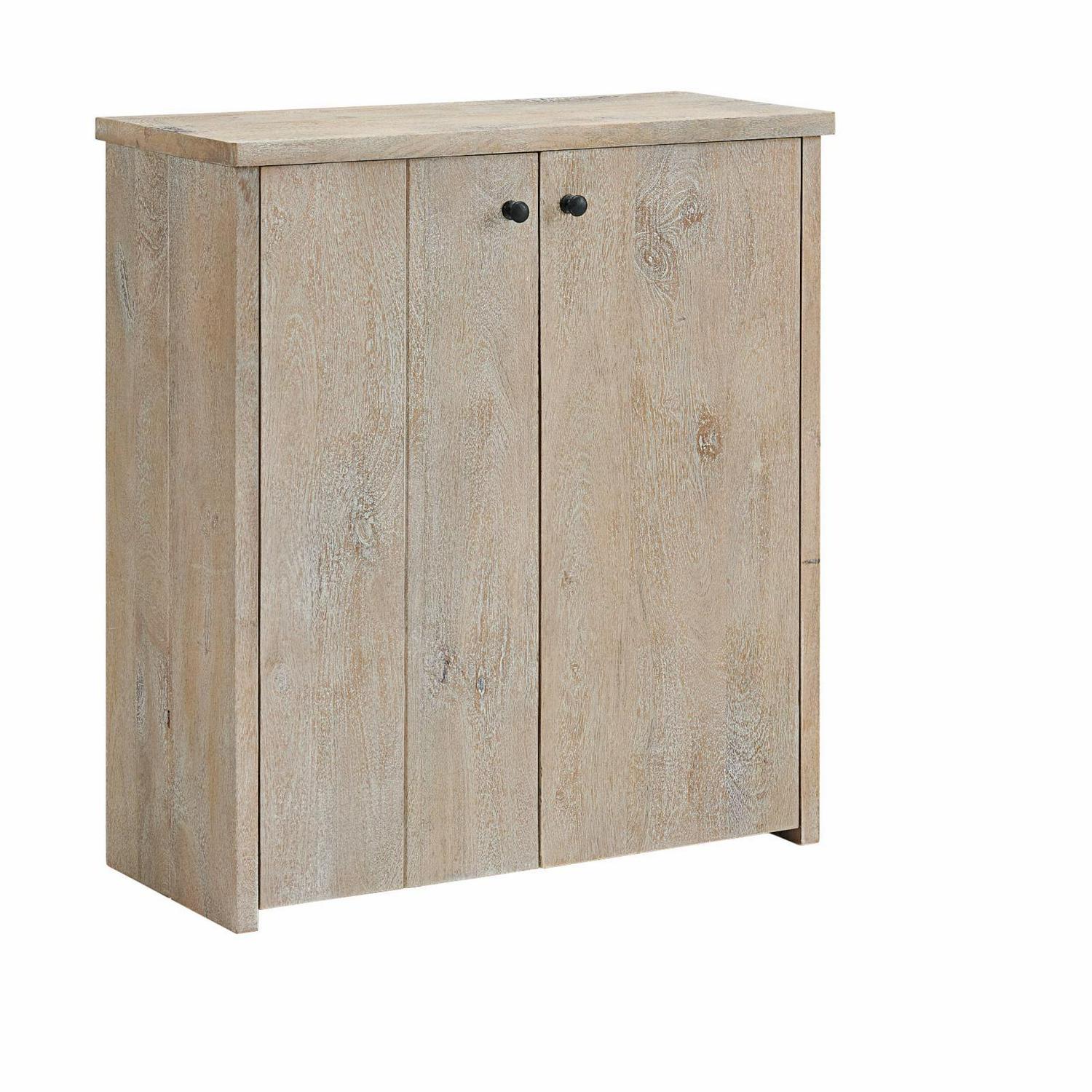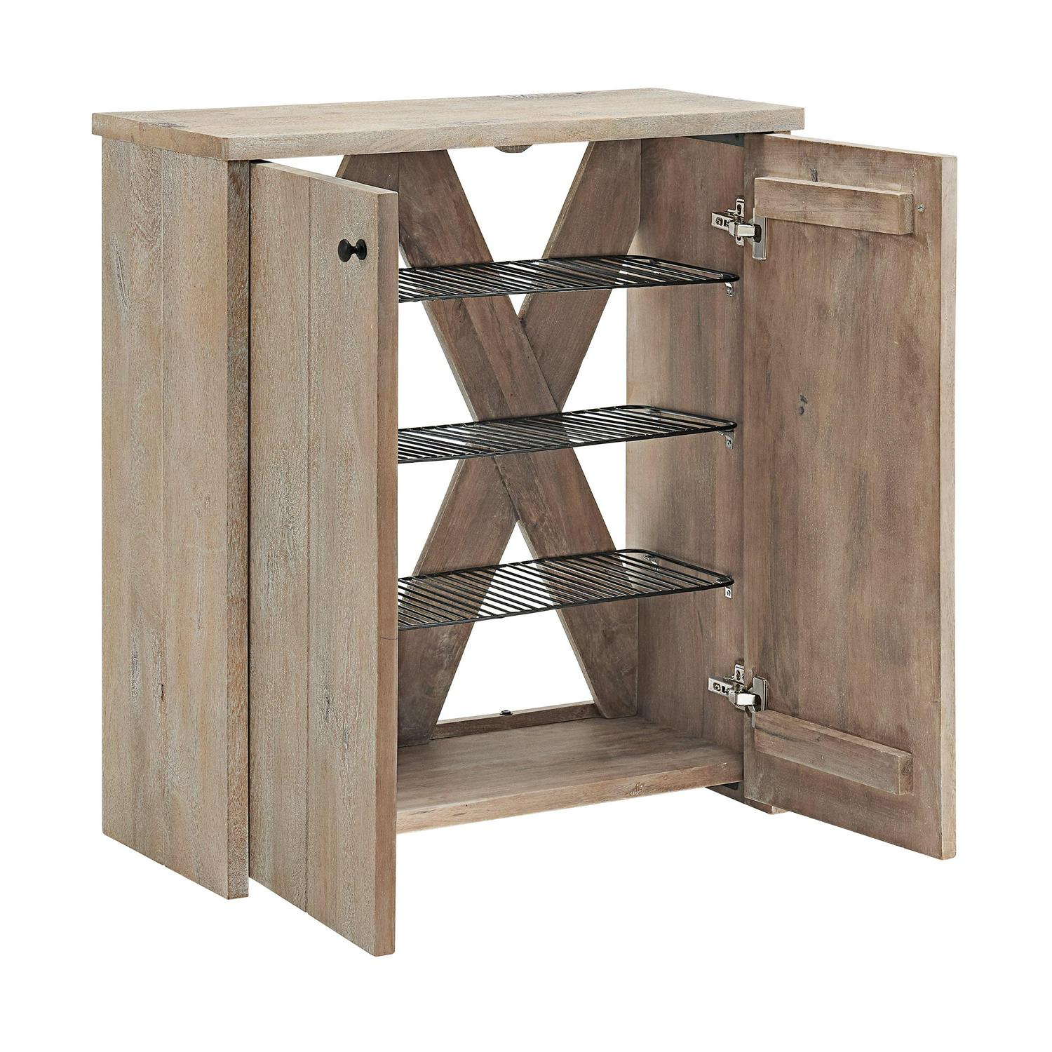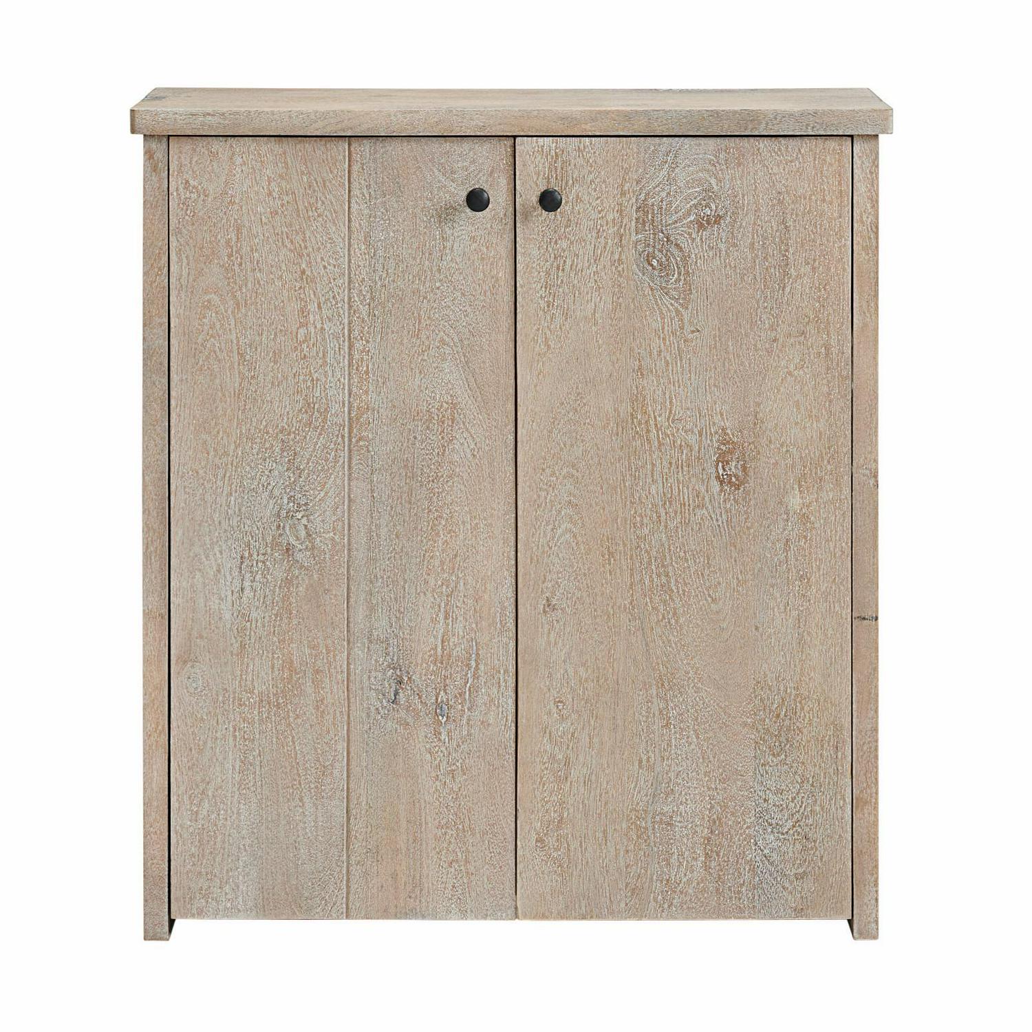 Organize your entryway, mudroom or living space with this gorgeous mango wood shoe cubbie. The shoe cubbie cabinet is both beautiful and functional, providing ample storage and style for your home’s entryway or hallway. Made from solid mango wood, the driftwood stain highlights the subtle imperfections such as knots and cracks that are part of the wood’s character. Behind the two doors are three fixed wire shelves to keep shoes from cluttering your floors. The cubbie cabinet can also be used for books, scarves, gloves or other accessories.