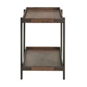 A perfect blend of rustic and industrial style, this beautiful collection will blend seamlessly in your living space.The side table with shelf is a perfect spot for your favorite lamp, books, magazines, or knick knacks. Featuring solid wood tray tops that are fixed in place with metal accents and metal legs. Mix and match to achieve your desired look.