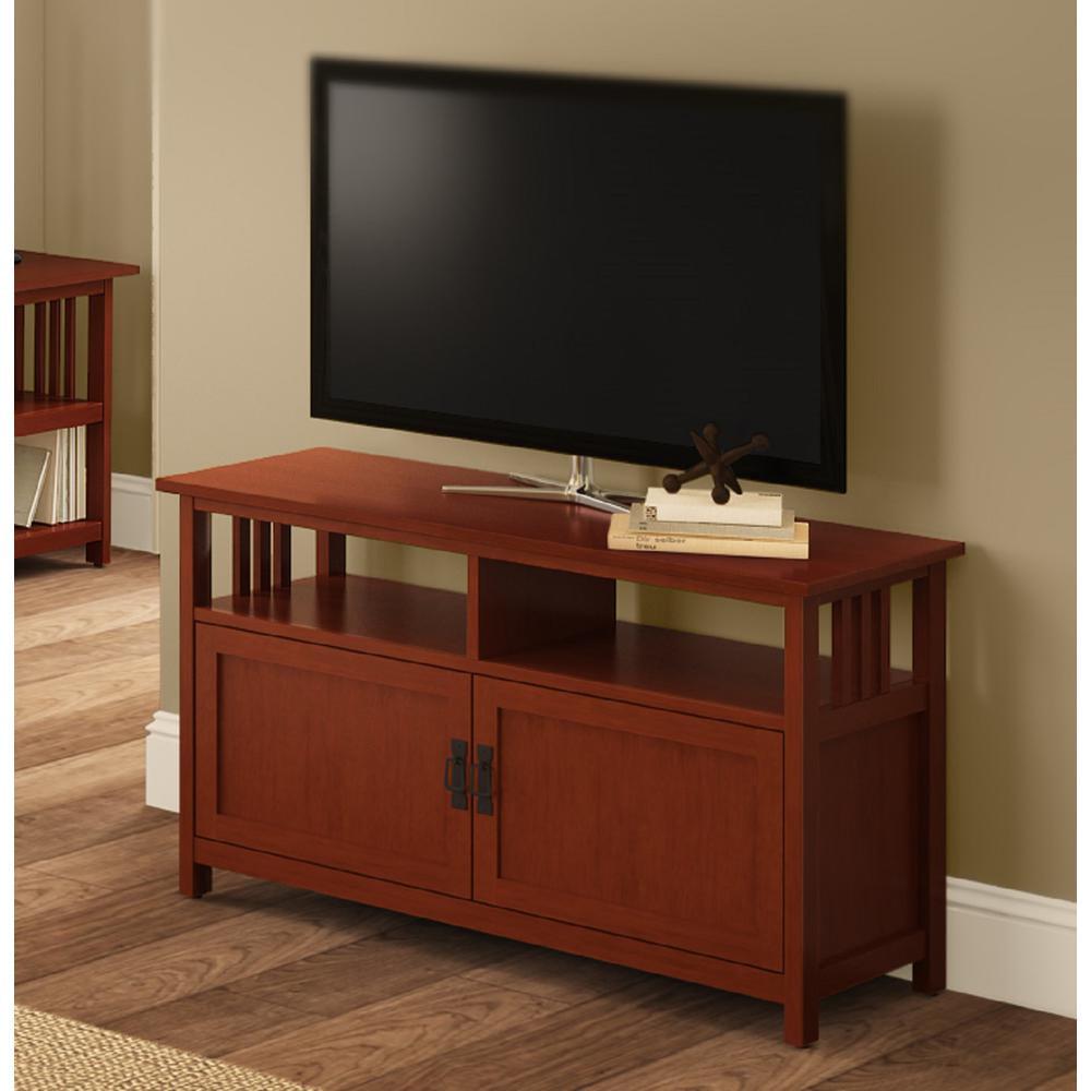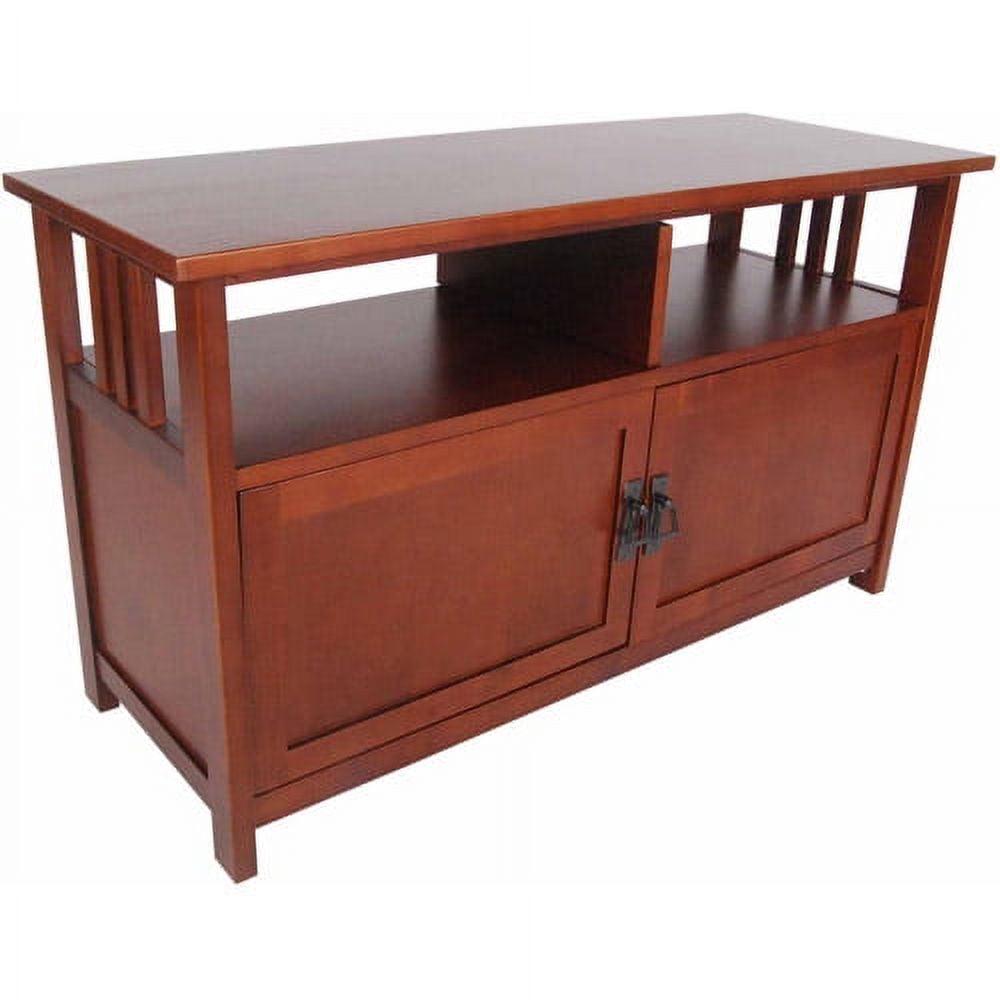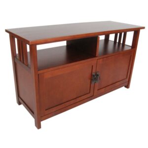 The Alaterre Mission TV Stand has a sleek design with subtle decorative touches. Its smooth surfaces and straight lines create an appealing and versatile look that coordinates well with many styles of interior decor. The stand is built from select hardwoods and finished in your choice of light cherry or dark espresso. Its spacious storage areas can hold a wide variety of media equipment. This hardwood TV stand features two open shelves and a cabinet with doors so you can organize movie collections, video games and more. It makes a functional and decorative addition to living rooms, dens and bedrooms. Create a beautiful and organized home entertainment area with the Alaterre Mission TV Stand.