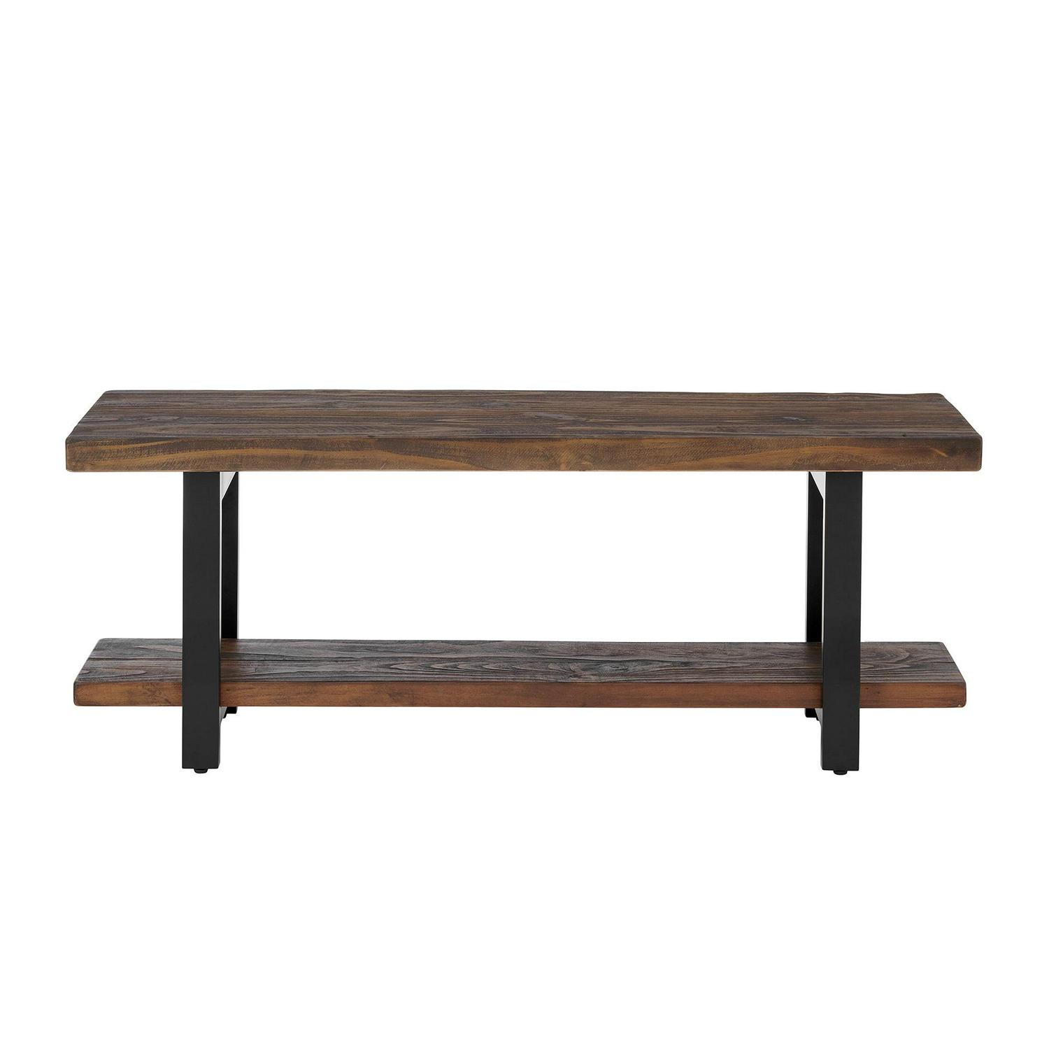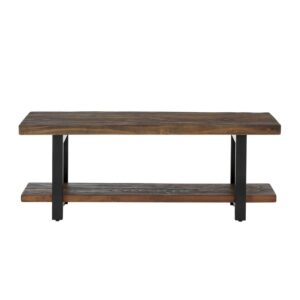 The Pomona collection features the exquisite workmanship of a solid wood top with metal legs that will last for years to come. Each piece is constructed of solid pine wood and finished to have the appearance of reclaimed wood. The reclaimed wood finish highlights natural wood variations such as cracks and knots which add to the piece’s character. Any item in this collection will add to the rustic industrial style of any space. Pomona Bench is versatile and perfect for your entryway, dining, or living room. Sit on the bench to put on or remove your shoes.