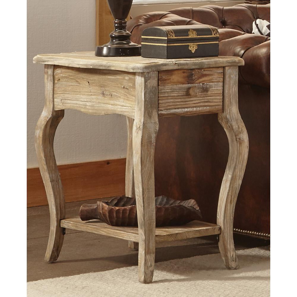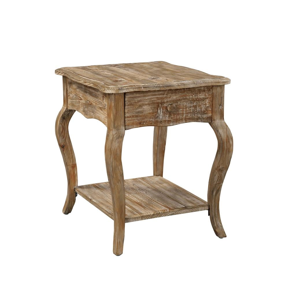 Alaterre Furniture Rustic Solid Wood End Table with Drawer and Shelf, Driftwood Finish – Accent Furniture with Queen Anne Legs, Natural