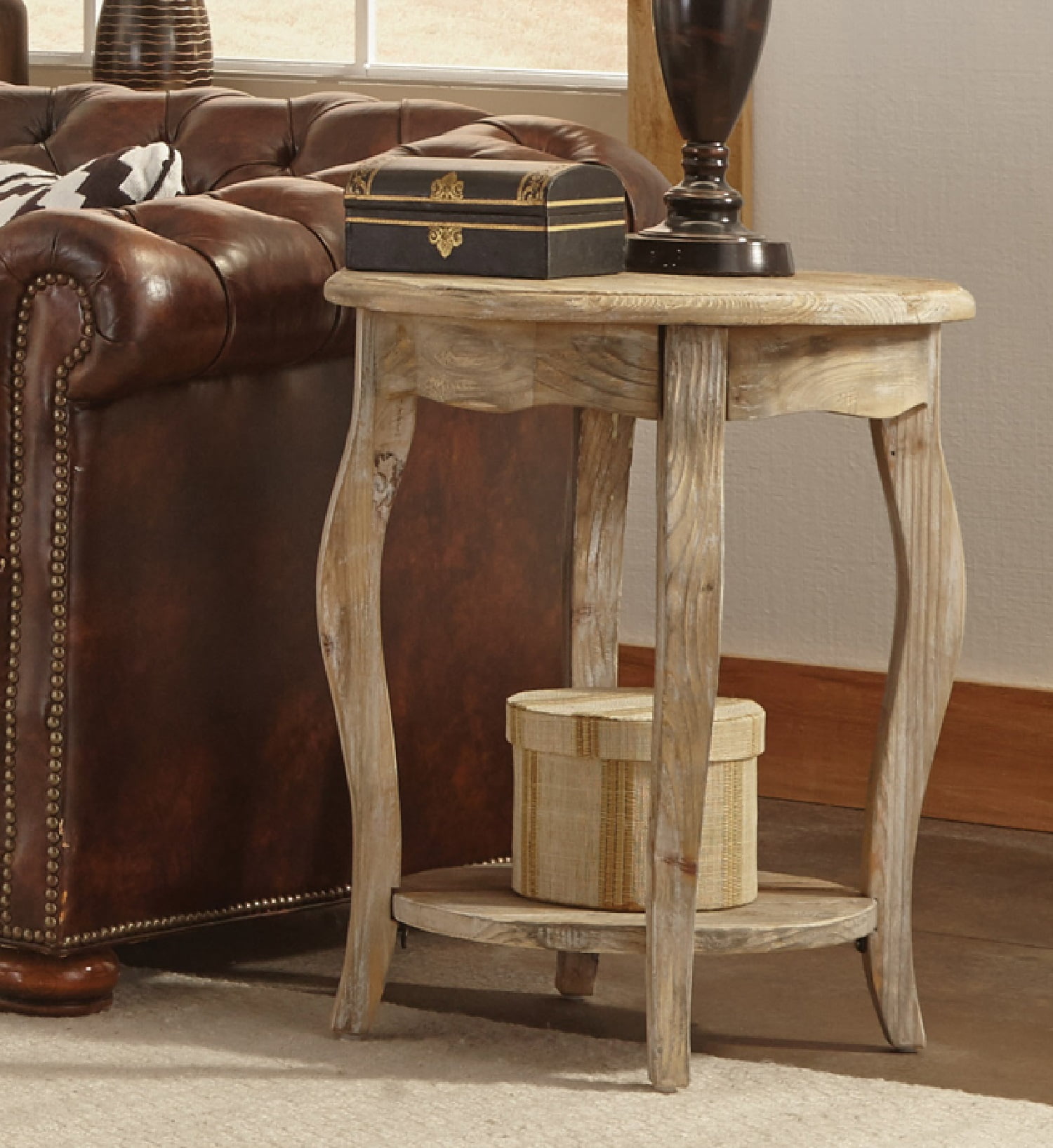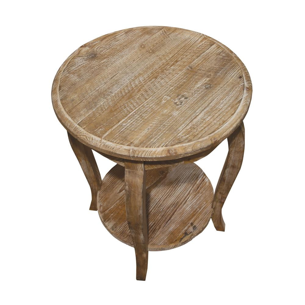 [DESIGN AND FUNCTIONALITY] Exquisite Queen Anne legs and a scalloped edge design lend a traditional touch to this 20″ diameter round end table; includes a lower shelf for displaying decorative items or storing books; [MATERIAL AND DURABILITY] This cedar wood end table features a driftwood-look finish, adding textured, rustic charm. Its robust construction ensures long-lasting beauty, while its weathered appearance highlights natural variations and history [ENVIRONMENTAL IMPACT AND AUTHENTICITY] Made from recycled wood, this rustic end table showcases a driftwood finish with natural imperfections, including knots and cracks, adding character [SPACE-SAVING ELEGANCE] At 20 inches in diameter, this round end table fits small spaces while offering surface area and a lower shelf for additional storage [UNIQUE CRAFTSMANSHIP AND DETAIL] Each Rustic Reclaimed Round End Table features curved legs and a scalloped edge, blending traditional craftsmanship with rustic charm. Its 20-inch diameter surface and lower shelf provide versatile use