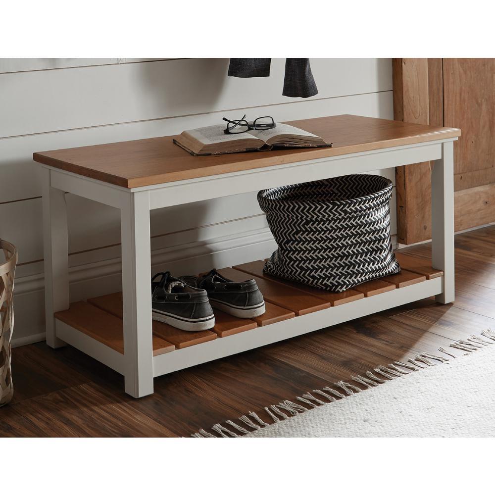 Savannah collection offers modern cottage styling; with its wood top and white painted legs it offers fresh style to your living space. Savannah includes end tables, console tables and media/storage pieces. You can design the perfect living room for your home. Roomy bench with slat shelf. It is perfect for your entryway, mudroom or bedroom.