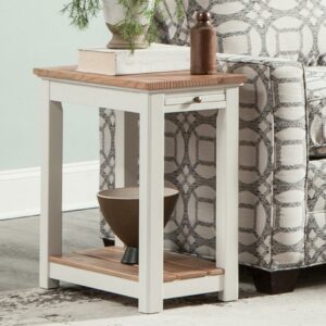 Alaterre Savannah Chairside End Table with Pull-out Shelf, Ivory with Natural Wood Top