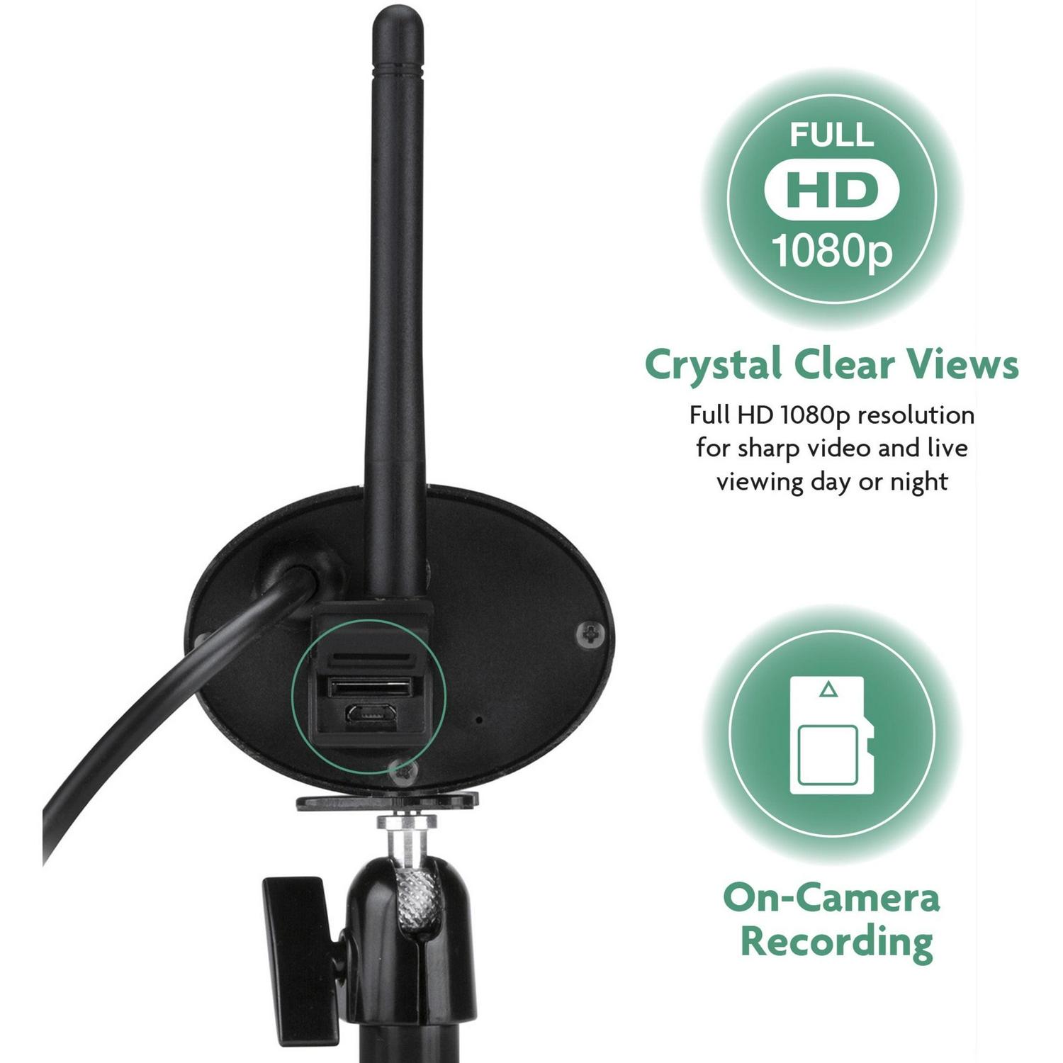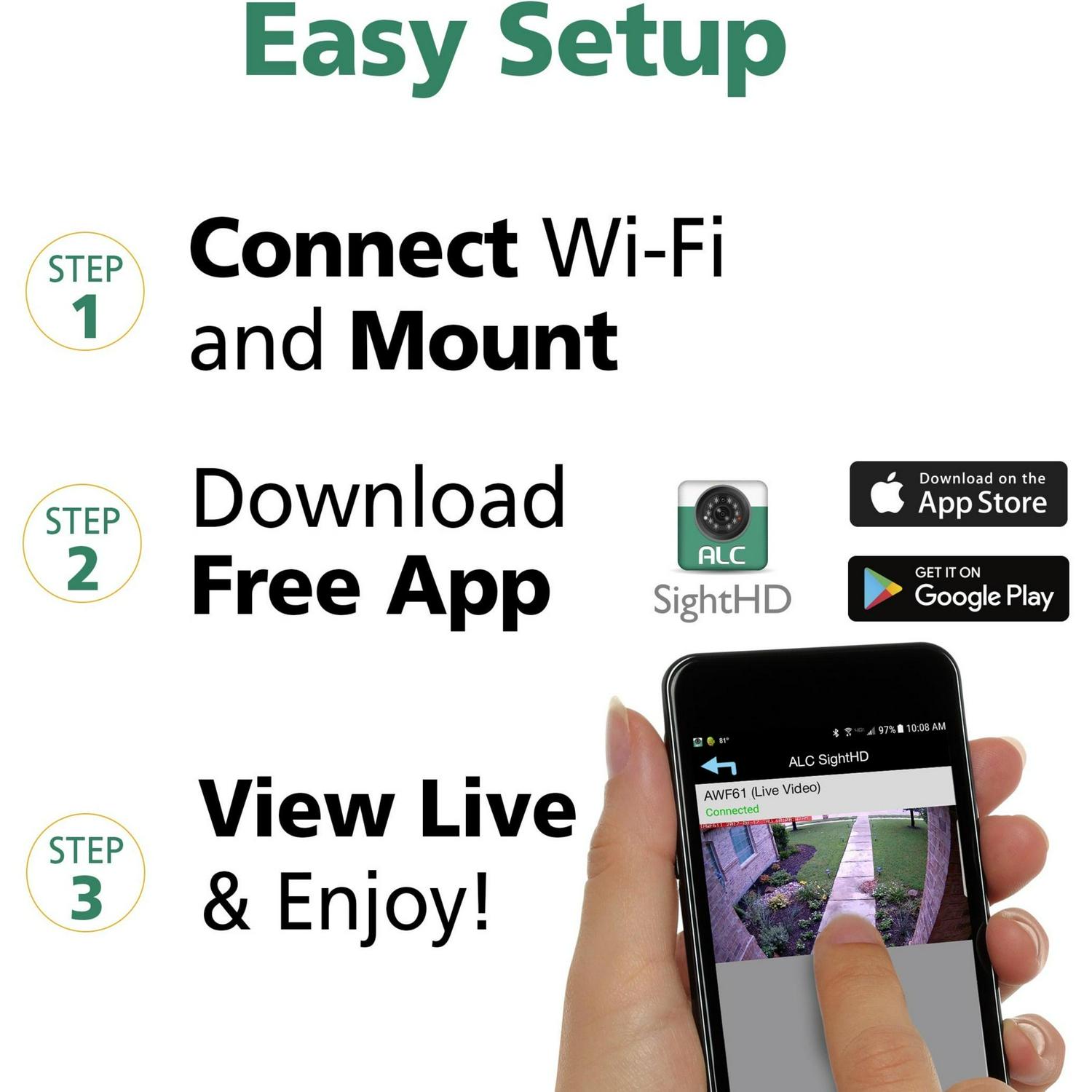 1080P HD Quality Video (1280 x 1080) resolution for optimal crystal clear streaming, playback, and recording,Infrared (cut) filters adjust the camera lens by day for accurate colors during daylight,Night vision up to 65-ft. with sharp black and white contrast from 6 surface-mounted high-power Infrared LEDs even in low-light conditions or total darkness,IP-66 rated weatherproof camera made from durable metal housing to withstand inclement weather conditions,Smart Motion Detection for more accurate recognition of breaches and fewer false alarms,Motion masking to block or ignore areas within camera view, such as moving tree limbs,On-camera recording to microSD card up to 128GB maximum capacity (not included),Automatic upload of recorded events from the camera directly to your personal Google Drive or Dropbox account,Instant email alerts and push notifications delivered through your smartphone or tablet through the free, downloadable ALC SightHD app.,Mounting brackets for outdoor installation and multi-position camera stand for indoor use,In the Box: (1) Outdoor/Indoor WiFi Video Camera, AC power adapter, power extension cord, USB cable and Quick Start Guide