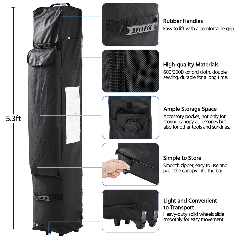No matter it is rainy or sunny, you can always have fun with your friends under this waterproof heavy-duty commercial pop-up canopy! Let this pop-up canopy help you hold a perfect party or BBQ in the backyard, protecting from rain or ultraviolet. This commercial heavy-duty canopy is height adjustable for different needs. There are three holes for height adjustment on each tubular column of the pop-up canopy. The adjustable range is from 227cm/89.4inch to 245cm/96.5inch. You can freely change the height of the canopy according to your needs.The thoughtful details of the pop-up gazebo make it very convenient to set up and disassemble. Also, a wheeled carry bag is provided for easy storage and portability. The folding pop up tent is perfect for outdoor sports, festival events, flea markets, parties, etc. We are dedicated to providing you with sincere service. If you have any problems or questions in the use process, please feel free to contact us for further assistance.This commercial canopy is suitable for outdoor activities, camping, wedding, picnic, BBQ, and other commercial uses. The foldable design makes the tent easy to use and pack.
