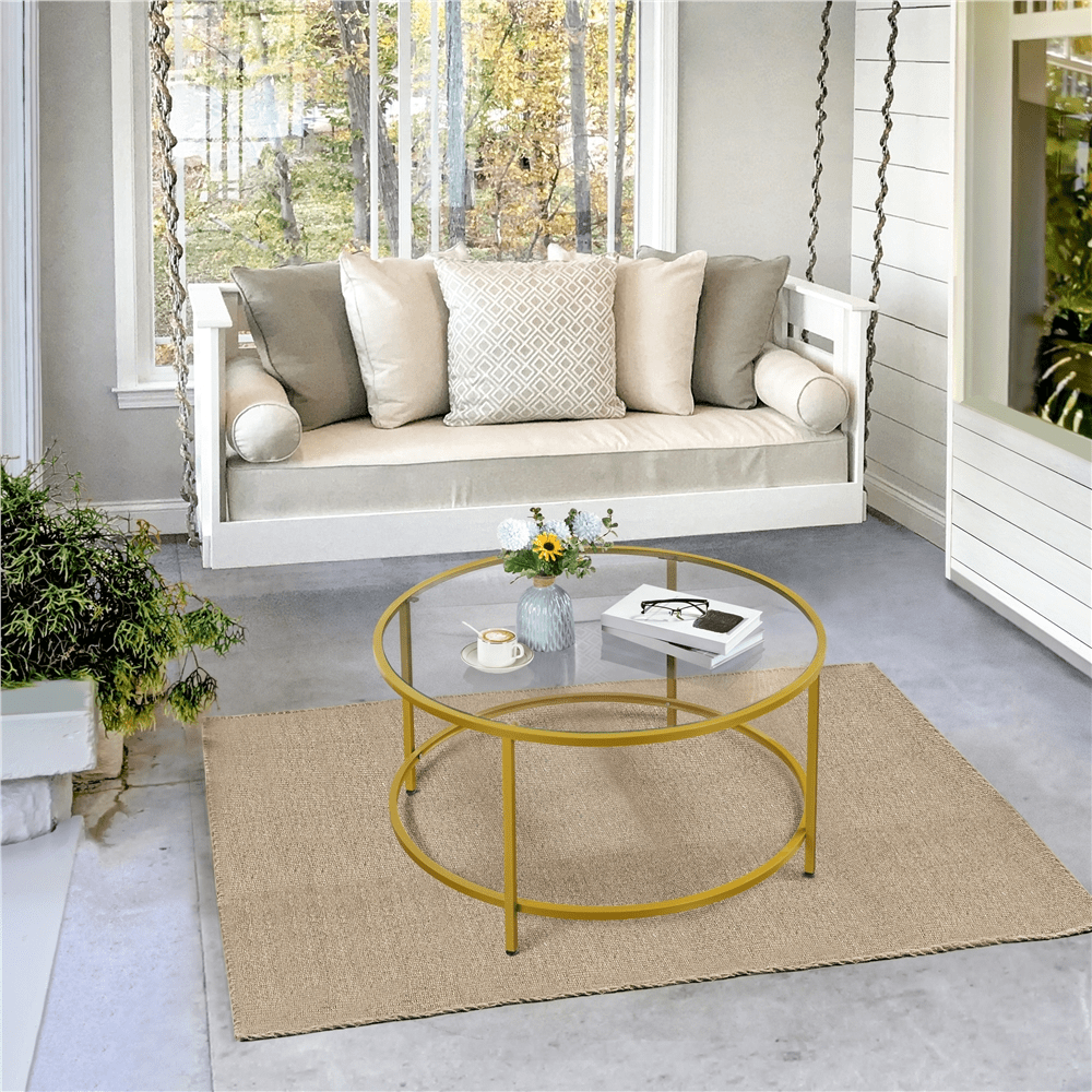 This 36″ Dia. x 18″ H round glass coffee table will brighten up any living room. The gold metal frame and glass tabletop are made of high quality, sturdy materials that guarantee this accent piece will last a long time. The spacious tabletop provides plenty of room to display plants, photos, books, and other decors. The encircled area beneath the tabletop is perfect for storage. This modern, round table will blend in with any home decor style in living rooms, bedrooms, offices, etc.