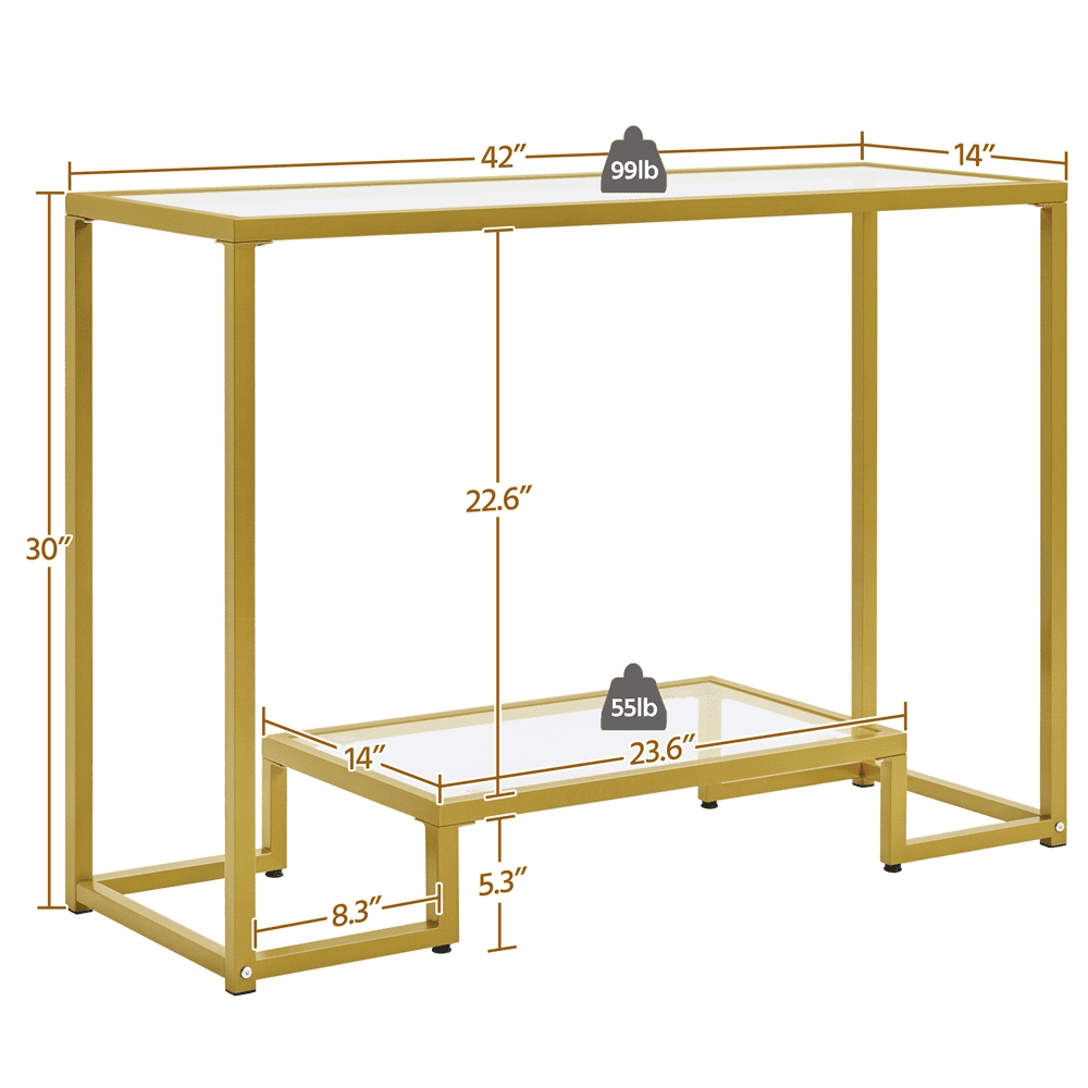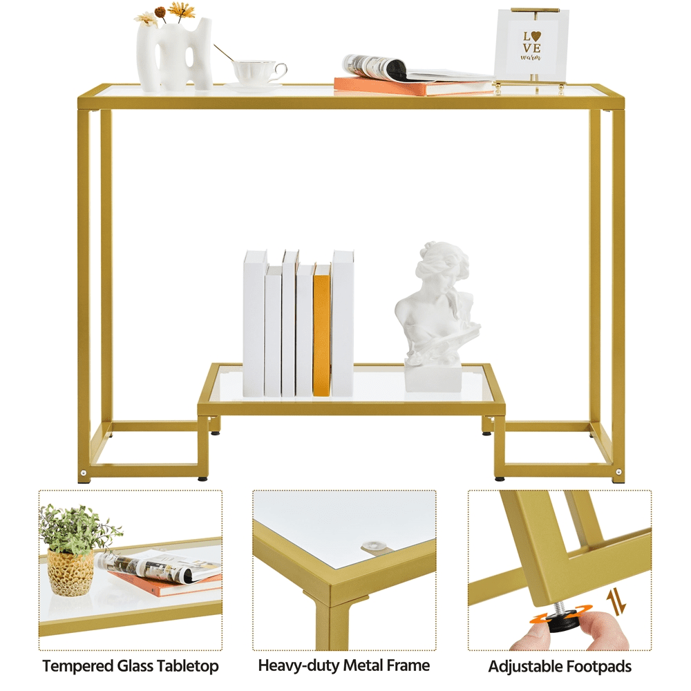 Alden Design 2-layer Modern Tempered Glass Console Table with Sturdy Metal Frame for Living Room Hallway, Gold Sleek metal frame, elegant tempered glass shelves 2-Layer Storage& Display Space This 2-layer glass console table boasts great adaptability, can also serve as a storage shelf in your home or office Adjustable feet are provided to help this console table better adapt to the uneven ground Color: gold Material: tempered glass, iron Dimension: 42 x 14 x 30 inch (L x W x H) Max Bearing:154 lb Tabletop: 99 lb Bottom Shelf: 55 lb G.W.:29.5 lb N.W.:25.5 lb Note: Please allow ±0.5’’ errors due to manual measurement. Please do not place items that exceed the max. weight capacity of the desk. Modern Style Easy Assembly