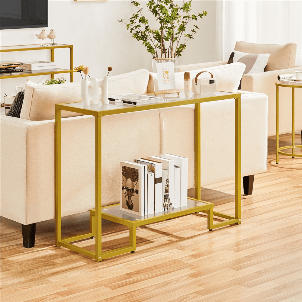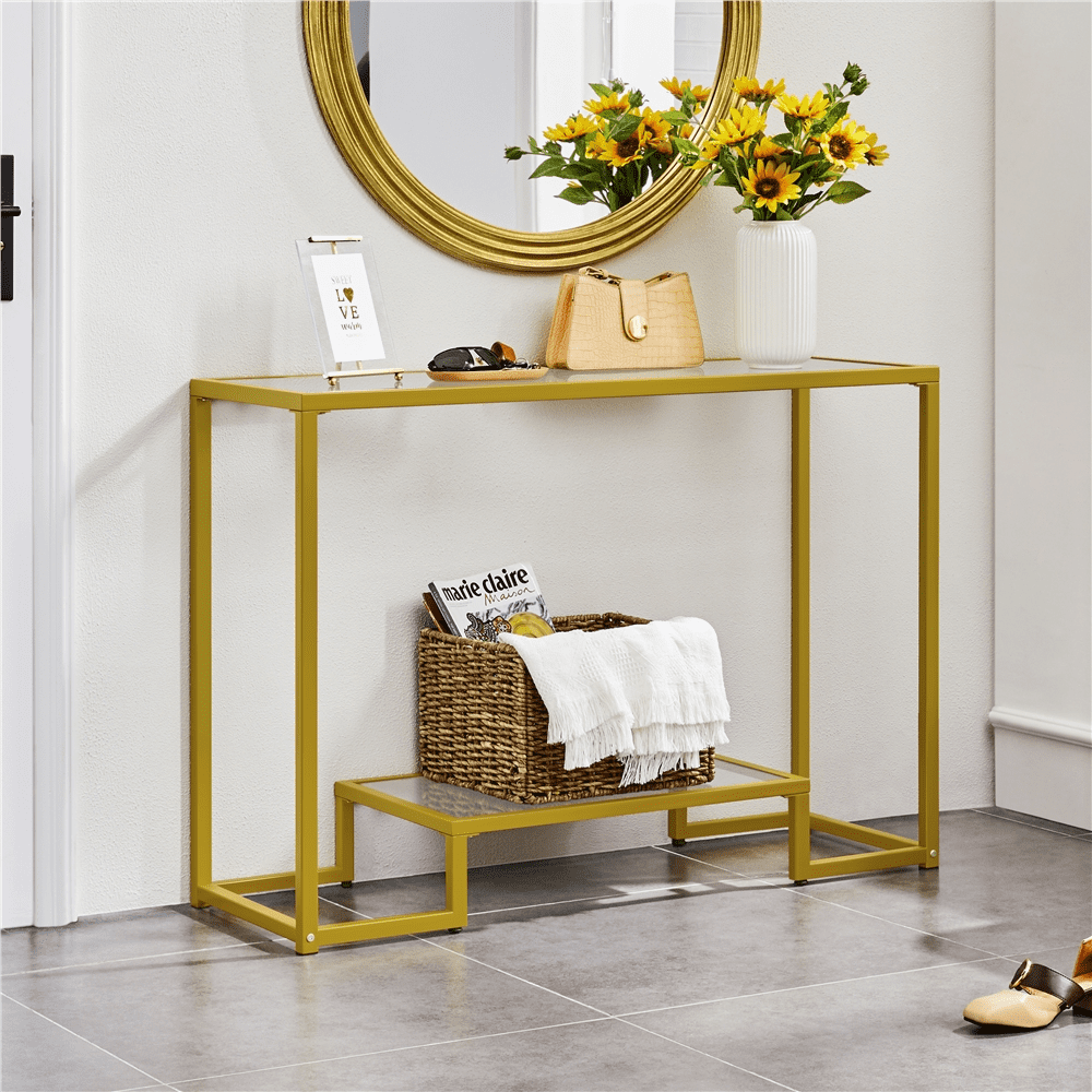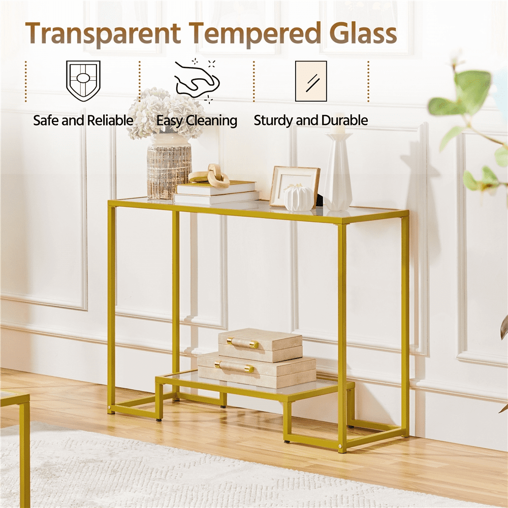 Alden Design 2-Layer Modern Tempered Glass Console Table with Metal Frame for Hallway, Gold