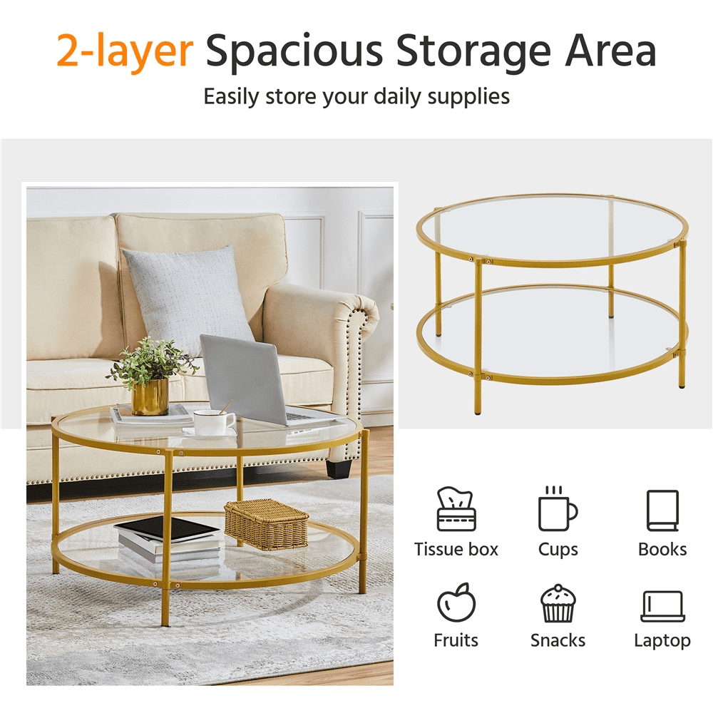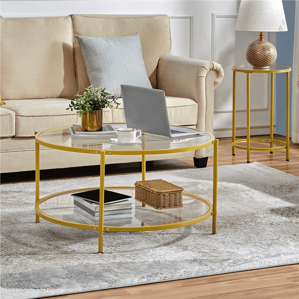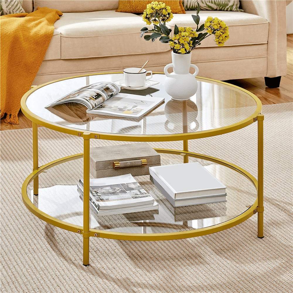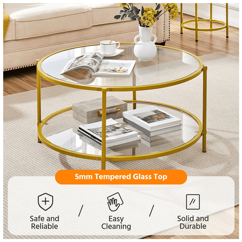 Smile Mart Modern Indoor Scratch-Resistant Round Glass Coffee Table with Iron Framed, Gold