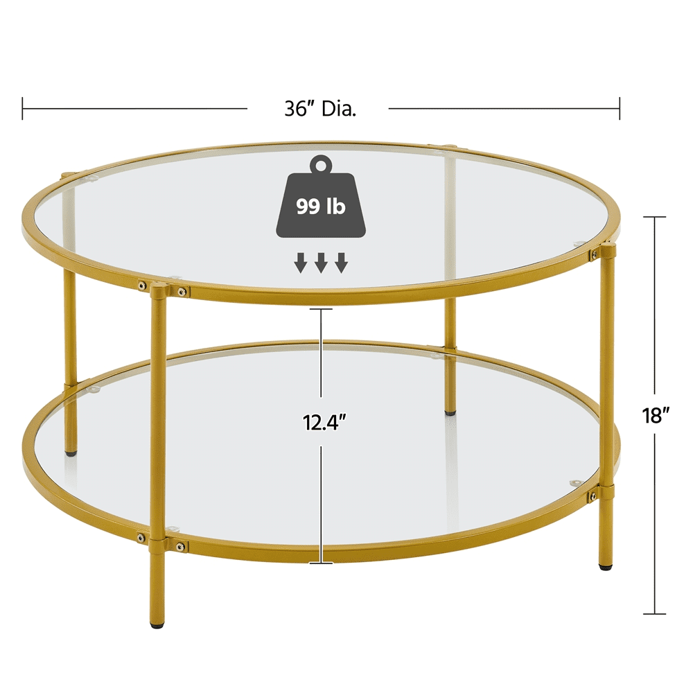 Alden Design 2-tier Modern Round Glass Coffee Table with Iron Framed for Living Room, Gold Color: Gold Material: Iron, tempered glass Assembled Dimension: 36″ Dia. × 18″ H Maximum Weight Capacity: 99 lb Item Weight: 38 lb Shipping Weight: 46.5 lb Note: Please allow ±1/2″ measurement tolerance. Strong Tempered Glass × Robust Frame Vertically Expanded Space Assembly Required Residential Use