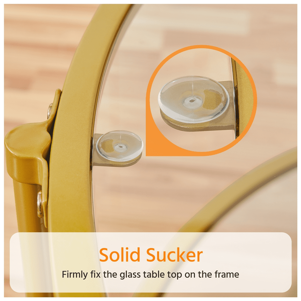 Add a bright spot to your living space or a vibrant green plant corner with this tempered-glass rounded coffee table. It comes with a chic flavor with the mixing of mustard gold/ matte black frame and crystal tempered glass top. The round shape and 18″ height make it perfect to serve as a table to serve your work, play, drink, or read on a carpet in front of your sofa or fireplace. The 36” Dia top is spacious enough to display green plants, ornaments, and other daily items. With the open bottom compartment design, you can have a bigger storage area to place higher boxes. Whether for the living room, office, apartment, or small space, this easy-to-match round end table would be an ideal statement to go without wrong and show your minimal aesthetic.
