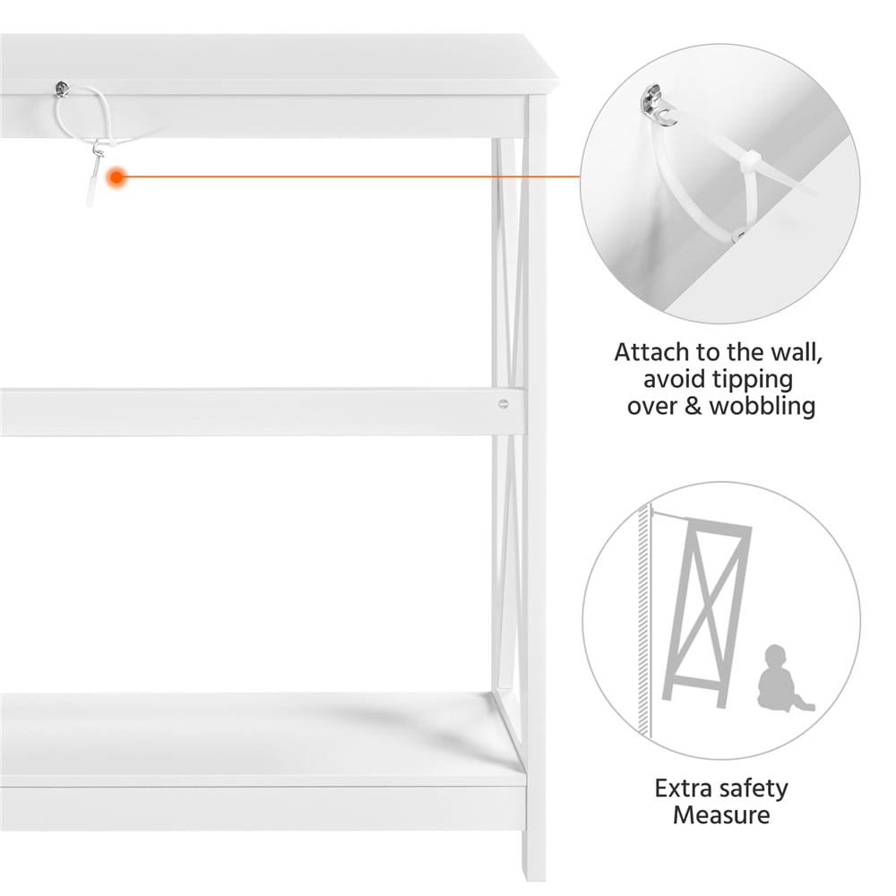 Alden Design 2-Tier X Design Wood Console Table with Shelf for Entryway Living Room, White Made from Painted MDF Measuring 40″ L × 32″ W × 11.8″ H X-shape structure offer better support Comes with an anti-tipping kit for firmly fixing it to the wall Easy-to-clean Easy assembly: instructions and necessary tools and hardware included Material: P2 Certified MDF Color: white Dimension: 40″ L x 11.8″ W x 32″ H Max. weight capacity on top: 79.4 lb. Max. weight capacity on bottom shelf: 57.3 lb. G.W.: 28.5 lb.