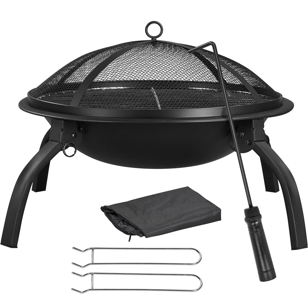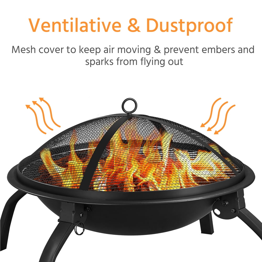 This outdoor fire pit is fully equipped with dual grates, one for wood burning and the other one for cooking. Also, it comes with a mesh lid, a fire poker, a carrying bag, 4 support legs and matching accessories. Thoughtfully designed with iron material, the four foldable sturdy legs securely attach to the fire bowl to provide stability. No tools are required for assembly. When not in use, the legs can be collapsed for easy storage and transportation. This BBQ firepit is perfect for warmth, a bonfire, or camping.