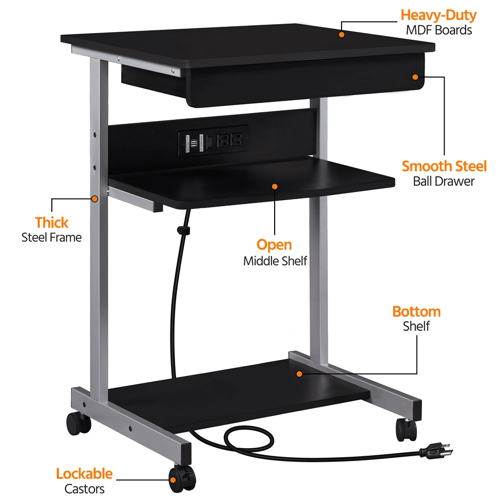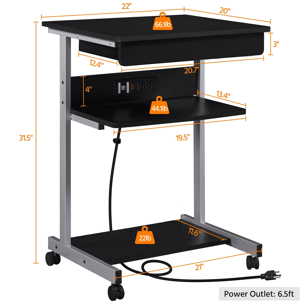 Alden Design 22in Rolling Laptop Computer Table with Power Outlet for Home, Black Color: Black Materials: CARB P2 MDF, Iron Overall Dimensions: 22″ L × 20″ W × 31.5″ H Smile Mart 22in Rolling Laptop Computer Table with Power Outlet for Home, Black Drawer: 20″ W × 12.4″ D × 3″ H Middle Shelf: 19.5″ L × 13.4″ W Bottom Shelf: 19.5″ L × 11.6″ W Max Weight Capacity: Top: 66 lb Drawer: 4.4 lb Middle Shelf: 44 lb Bottom Shelf: 22 lb Shipping Weight: 27 lb Item Weight: 24.4 lb Power Outlet: Length: 2m Rated Power: 1500W Ports: 2 ACs & 2 USB Comprising: a switch, a HOOK & LOOP Plugs: 3-plug Cable: double-insulated round wire Note: 1. Please allow ±1/2″ measurement tolerance. 2. Please do not use appliances that exceed the power rating of the power outlet! Built-in Power Outlet Heavy-duty Casters
