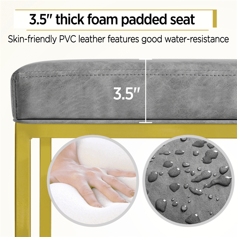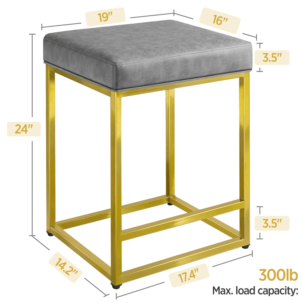 SmileMart 24″ H Modern Upholster Counter Bar Stools With Gold Frame, Gray Qty.: 2PCS Color: Gray cushion, Gold frame Material: PVC leather, Foam, Metal Overall size: 19” L x 16” W x 24” H Cushion size: 18.7” L x 15.6” W x 3.3” Thickness Square tube size: 0.8” L x 0.8” W Max. load capacity: 300lb G.W.: 31.7lb N.W.: 27.6lb Note: 1.Please allow ±1cm/0.5” errors due to the manual measurement. 2.For your safety, please do not stand on it.
