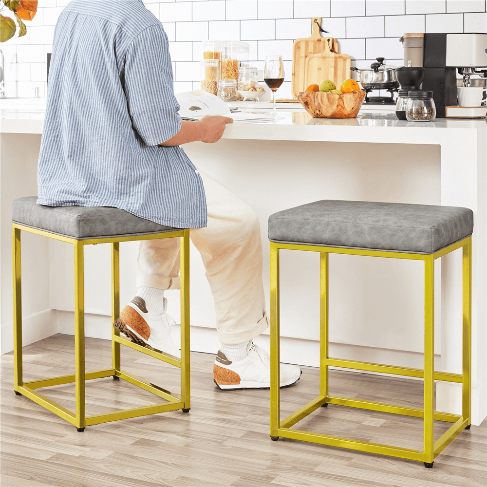 Looking for a practical counter bar stool for your home or business place? This pair of stools adopt fine materials which include PVC leather, soft foam and firm metal. Selected material makes these stools sturdy and durable. To protect your floor from being scratched, each leg is covered with protective footpads. Sitting for a long time will also be fine thanks to the footrest of one side, which allows you to change positions when you get tired. The modern industrial style and gold frame make these 2pcs stools compatible with other home decor.