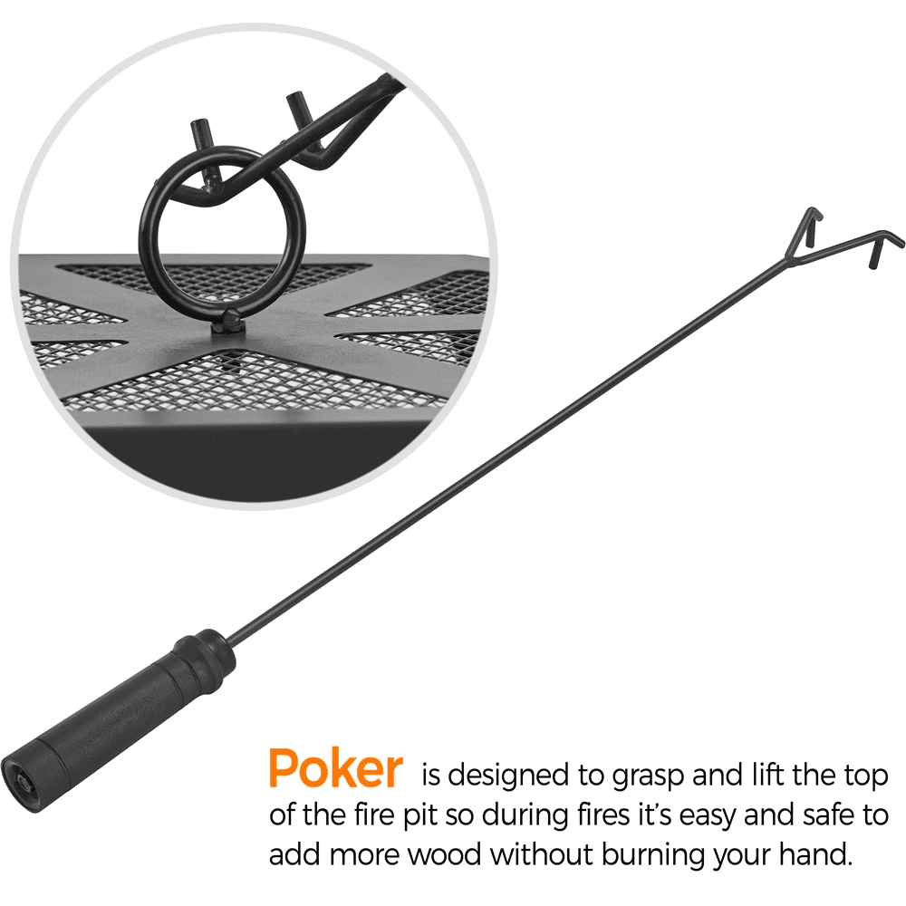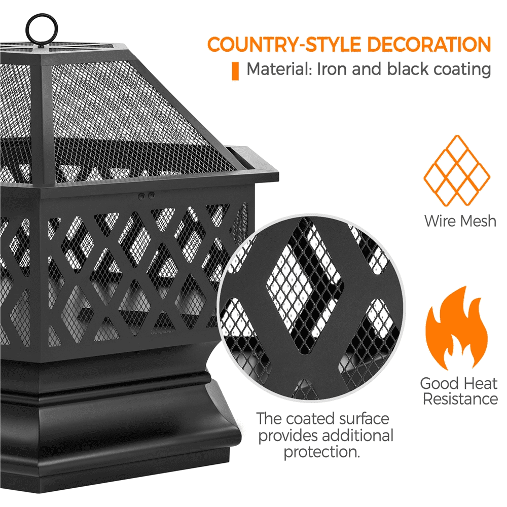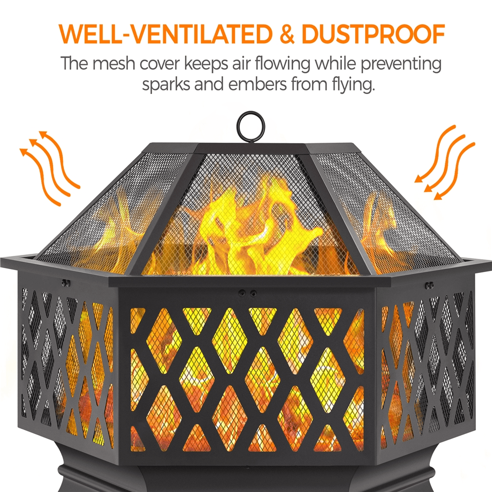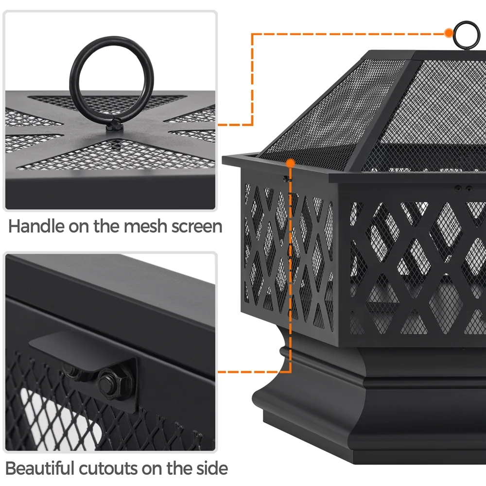 Extend your outdoor time and joy during winter and add the ambiance to your backyard with this 26″ hexagon firepit. With a chic hexagonal figure and cut-out walls, this outdoor fire pit brings both style and function to yards/porches/patios. Constructed of solid metal with heat-resistant coating, this outdoor fireplace features a deep fire bowl for plenty of firewood. It comes with a spark screen and fire poker to ensure added safety. With a compact size of 26″ L × 26″ W × 24″ H, this firepit can offer sufficient warmth for 6 to 10 people or be taken out with you for camping trips easily. Simple assembly is required.