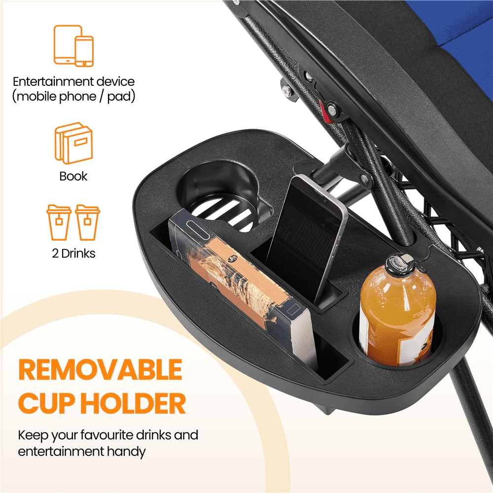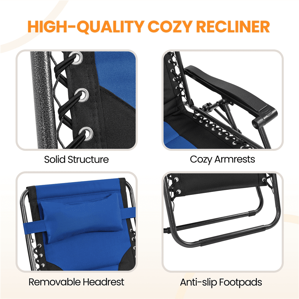 Alden Design 29in Foldable Padded Zero Gravity Chair with Cupholder/ Pillow for Outdoor, Navy Blue/Black