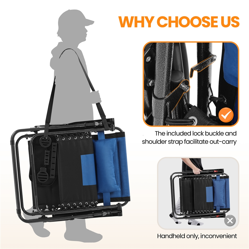 This padded 29-inch zero gravity outdoor recliner features an adaptive reclining system, allowing effortless backrest adjustment to your preferred angle and securing it in place for optimal relaxation. Its XL-sized cotton-padded seat and adjustable structure make this folded outdoor reclining chair ideal for fishing, napping, and sunbathing, providing softer, ampler, and upgraded comfortable support. The chair’s dimensions, both in its vertical and zero gravity positions, ensure spacious and cozy seating, accommodating various body shapes and sizes without strain.Crafted from 600*300D Oxford cloth, the recliner is lightweight, durable, and weather-resistant, making it suitable for outdoor use. Supported by a robust triangle-structured steel frame, it can hold up to 251 lb, ensuring safety and stability in both upright and reclined positions. Its high portability and space-saving design make it easy to store and transport, while the included buckle and strap enable secure folding and effortless carrying. Additionally, the recliner comes mostly assembled, saving time and effort required for setup.