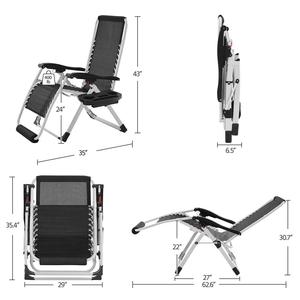 Alden Design 29in Foldable Zero Gravity Recliner with Padded Cushion for Garden, Gray Color: Gray Materials: Painted Steel, 550g Texteline Dimension: Unfolded: (zero gravity): 63 L × 27.5″ W × 30″ H Folded: 35.5″ L × 27.5″ W × 6.5″ Thickness Seat: 35″ Depth × 27.4″ Width Max Weight Capacity: 400 lb Item Weight: 21.1 lb Shipping Weight: 24.8 lb Note: Please allow ± 1/2″ measurement tolerance.