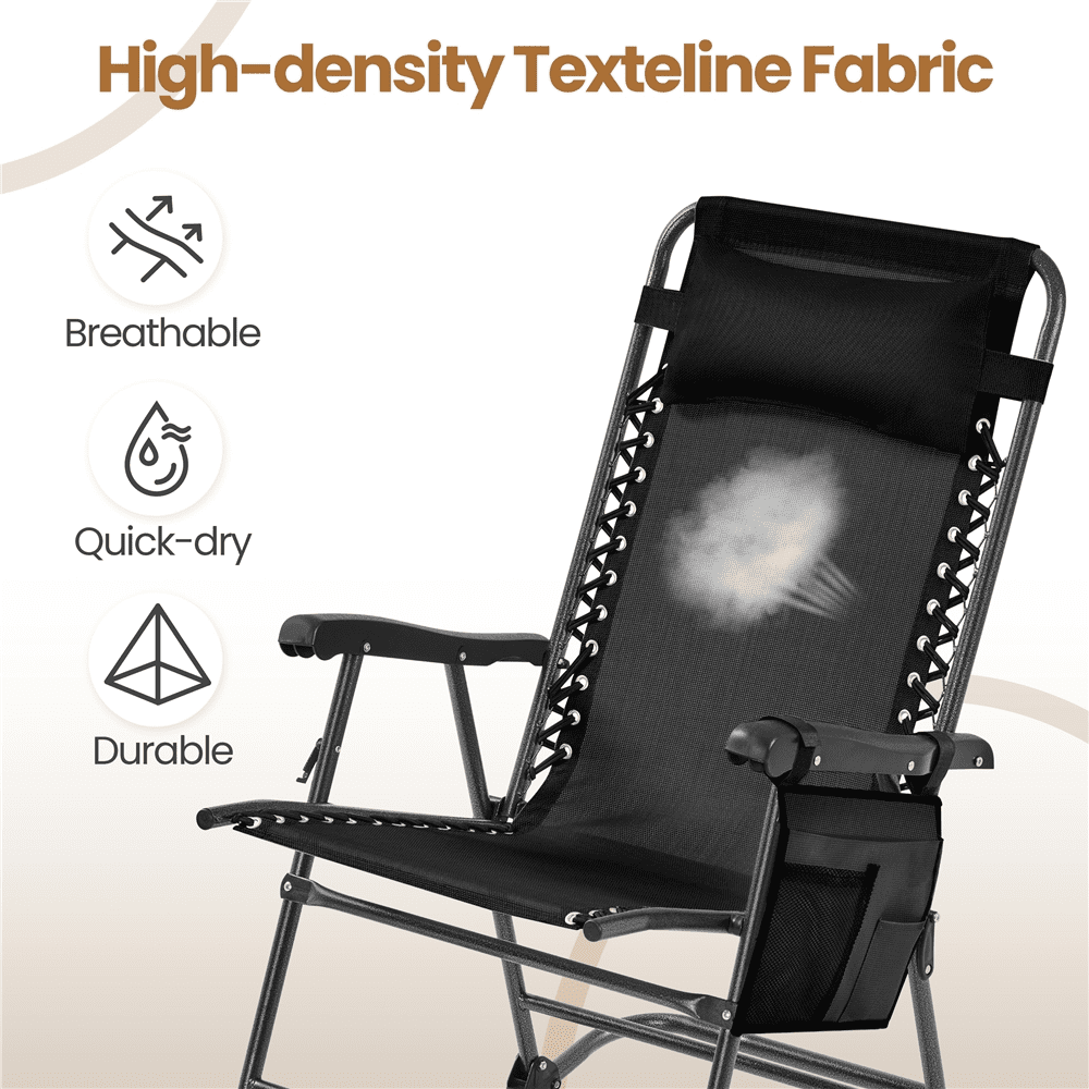 This set of 2 Rocking Folded Zero Gravity Reclining Chair offers an adaptive reclining system and an arc-shaped support for extra rocking fun. Its elastic strap-fixed Texteline surface and adjustable backrest provide cozy, body-molding support; added with a spacious seat, wide armrests, and footrest, enabling natural stretching of your legs and arms without strain and making it an essential for relaxation activities like sunbathing, napping, and chatting. Crafted from 550g thick Texteline, the chair features lightweight, nice durability, and low-maintenance, ensuring weather resistance and long-term service. The heavy-duty painted steel frame ensures safety and stability in both upright and zero gravity modes. It comes with an unfixed cotton-padded pillow and a hanging storage bag, offering convenience and practicality. This rock outdoor recliner, arriving fully assembled and out of the box, saves you from head-scratching installation.