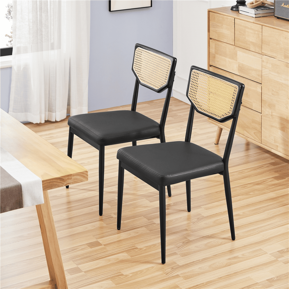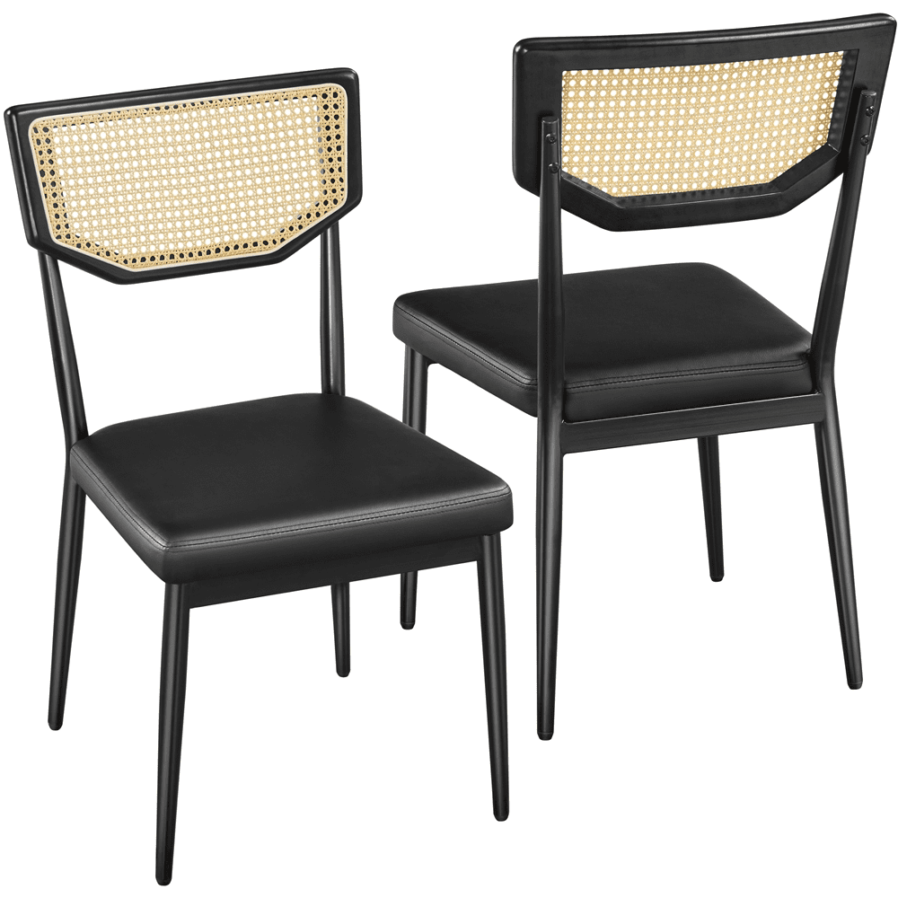 Alden Design 2pcs Faux Leather Dining Chairs with Rattan Backrest & Cushioned Seat for Kitchen, Black