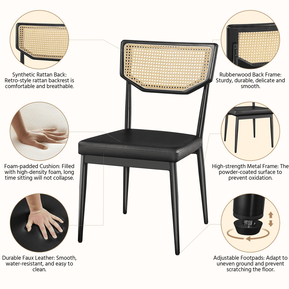 Are you seeking a unique and distinctive addition to your living space? To enhance the durability of our dining chairs, we incorporate four robust metal legs for strong support of holding up to 300lb. To create a stylish aesthetic that blends both retro and modern elements, we opt for a PE+PP rattan back and a cushioned seat, ensuring a flexible and comfortable seating experience. Our chair features a foam-padded seat, smooth faux leather covering, synthetic rattan backrest, and a neutral black metal construction. The combination of different materials creates a blend of modern and retro styles.