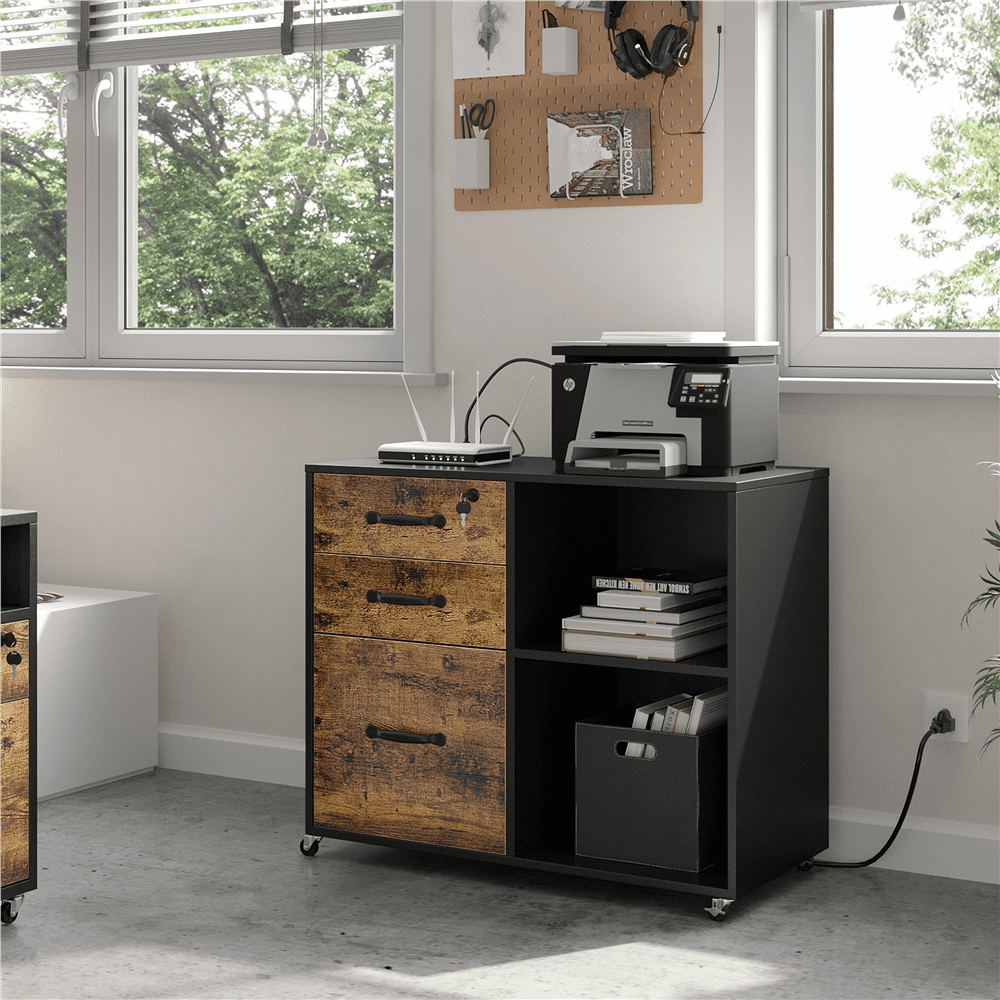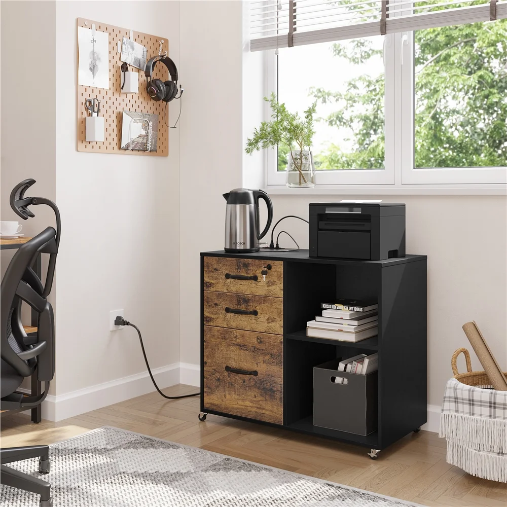 Alden Design 3-Drawer Mobile Vintage File Cabinet with Power Outlet Black, Rustic Brown