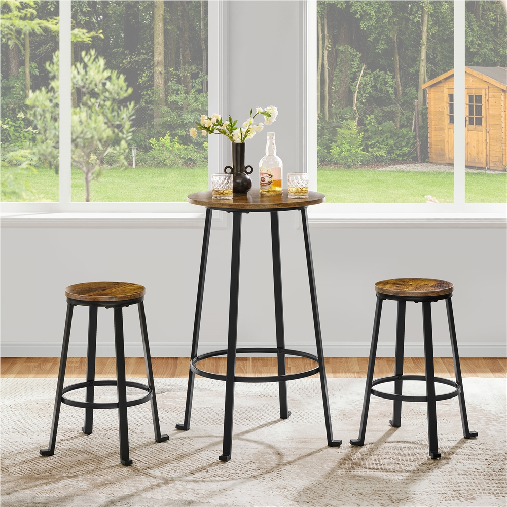Are you looking for a set of bar table and stools? This 3-piece bistro set is a rustic addition to any dining room or kitchen. Our rustic-style bar table and stool set features a strong metal frame with a powder-coated finish, paired with durable CARB P2 MDF tabletop and seat. This set is built to last, with a table that can hold up to 90kg/198lb and each stool capable of supporting up to 136kg/300lb. Both the table and stools have circular footrests that make them more stable and provide a comfortable place for users to rest their legs. This pub table set adds a touch of industrial style to any of your living spaces. It also blends seamlessly with rustic surroundings or décors, making it a versatile piece in your living space, like kitchens, dining rooms, living rooms, pubs, cafés, restaurants, etc.
