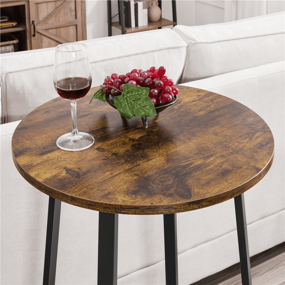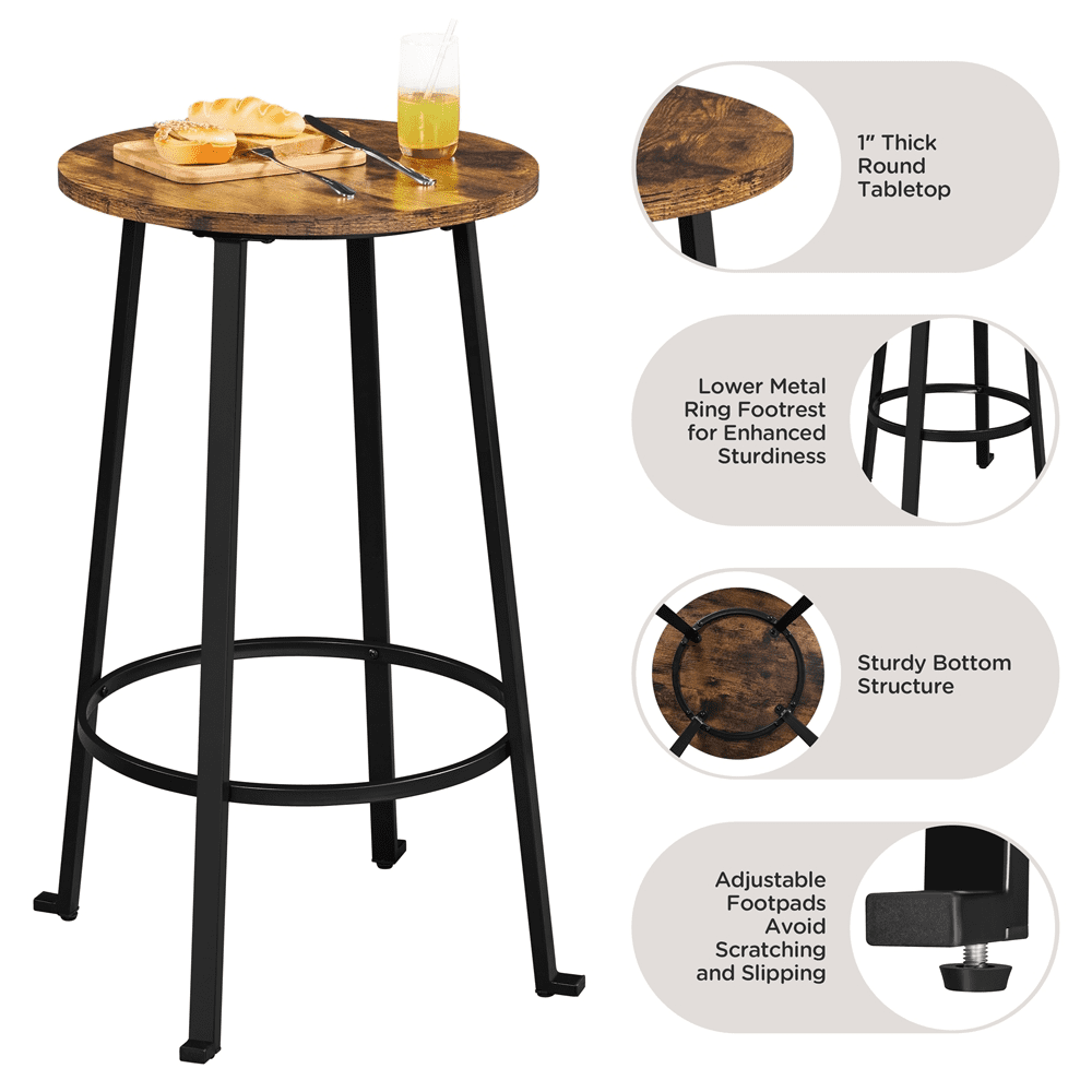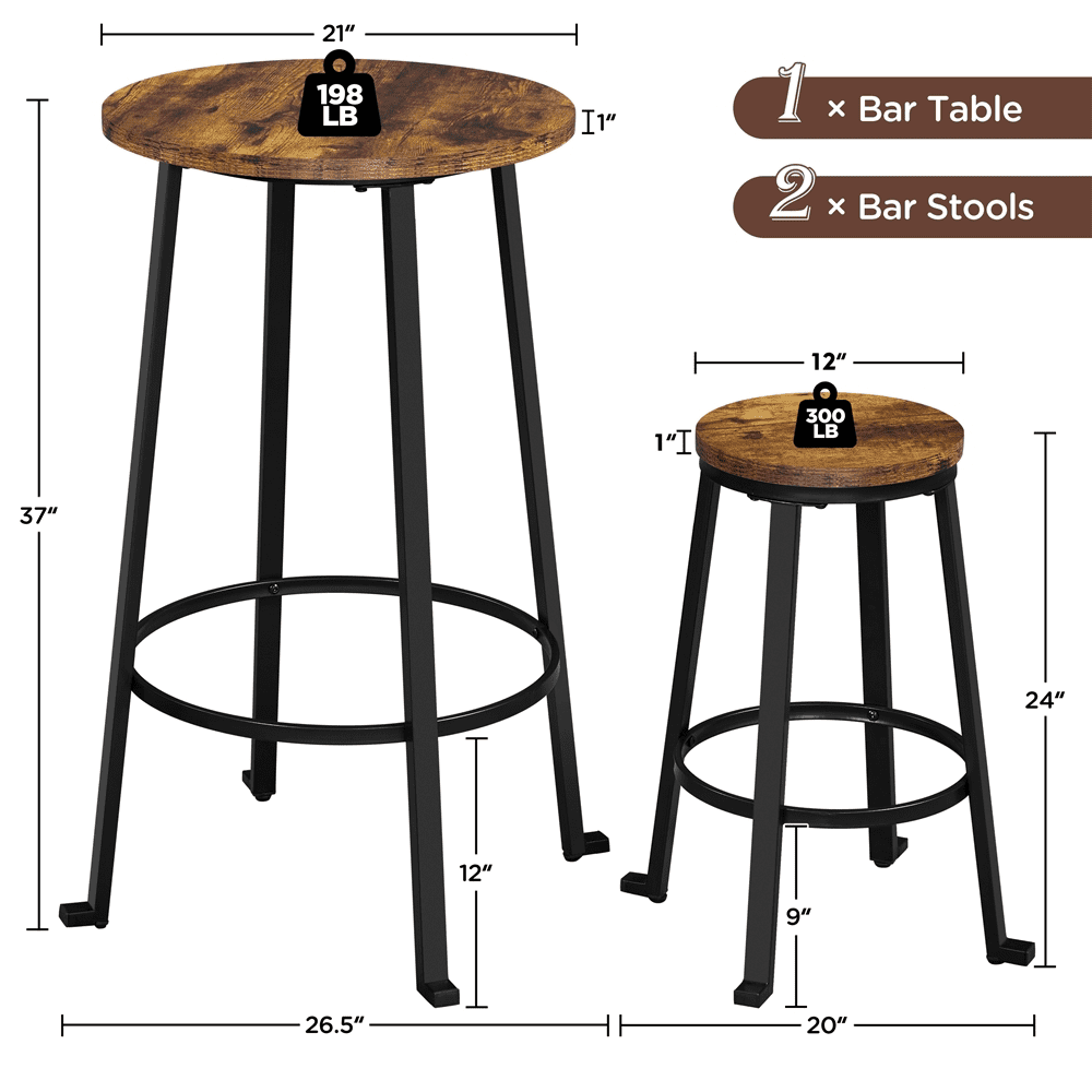 SmileMart 3-Piece Wooden Bistro Bar Set with Metal Legs for Kitchen, Rustic Brown Color: Rustic Brown Material: MDF, Powder-coated Metal Assembled Dimensions: Table: 26.5″ × 26.5″ × 37″ Stool: 20″ × 20″ × 24″ Table Diameter: 21″ Seat Diameter: 12″ Ground Clearance (from footrest to ground): table: 12″; chair: 8.7″ Max. Load Capacity: table: 198 lb, each stool: 300 lb Item Weight: total: 31.3 lb; bar stool (2pcs): 15 lb; bar table: 15 lb Shipping Weight: 36 lb Package Includes: 1 Bar Table 2 Bar Stools 1 Accessory Kits 1 Assembly Instructions Note: 1. Please allow a ±0.5″ measurement tolerance. 2. For your safety, please do not stand on the table or the stool. Rustic Industrial Bistro Set Heavy-duty Bar Table