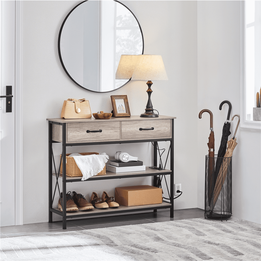 Alden Design 3 Tier Console Table with Power Outlet 2-Drawers & 2-Shelves for Entryway, Gray