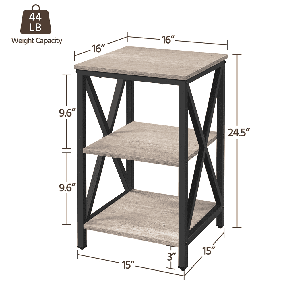 Alden Design 3 Tier X Frame Side Table for Living Room, Gray Material: MDF and Iron Dimension: 16x16x24.5″”(LxWxH) Tabletop Max. Weight Capacity: 66lb Shelf Max. Weight Capacity: 22lb G.W.: 22.4 Lb Color Options: Rustic Brown and Rustic Gray Note: Please allow ±1cm error due to manual measurement. Easy to assemble: all necessary parts and hardware are included
