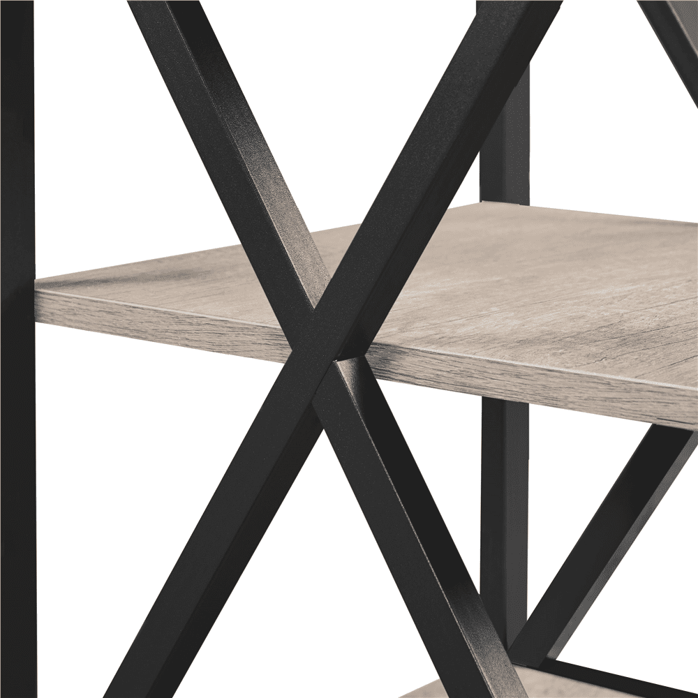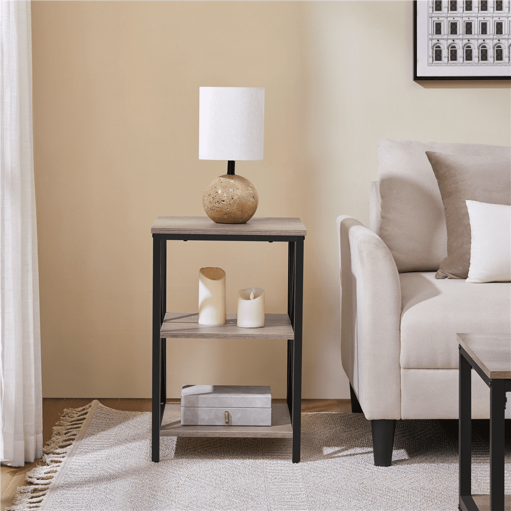 This industrial X-design end table by River Street Designs is the perfect piece for your living room. The sturdy, high quality metal frame and durable wood shelves guarantee that this end table will last a long time. The 3-tiers offer ample storage space to organize living room clutter or display decor. The elegant, sleek design blends in perfectly with any and all home decor. This is the perfect accent piece for your living room, bedroom, den, or home office! Simple assembly is required and detailed instructions are included.