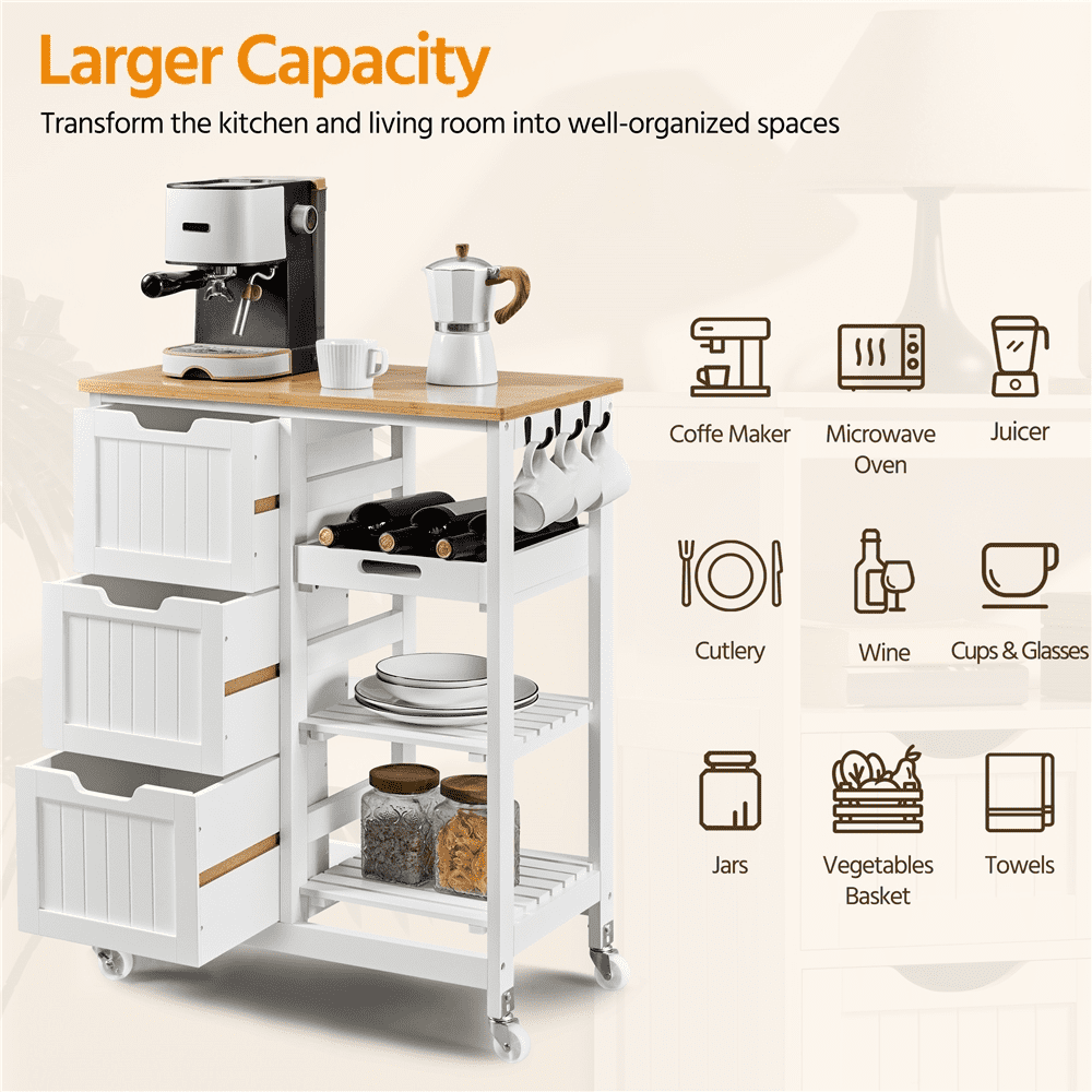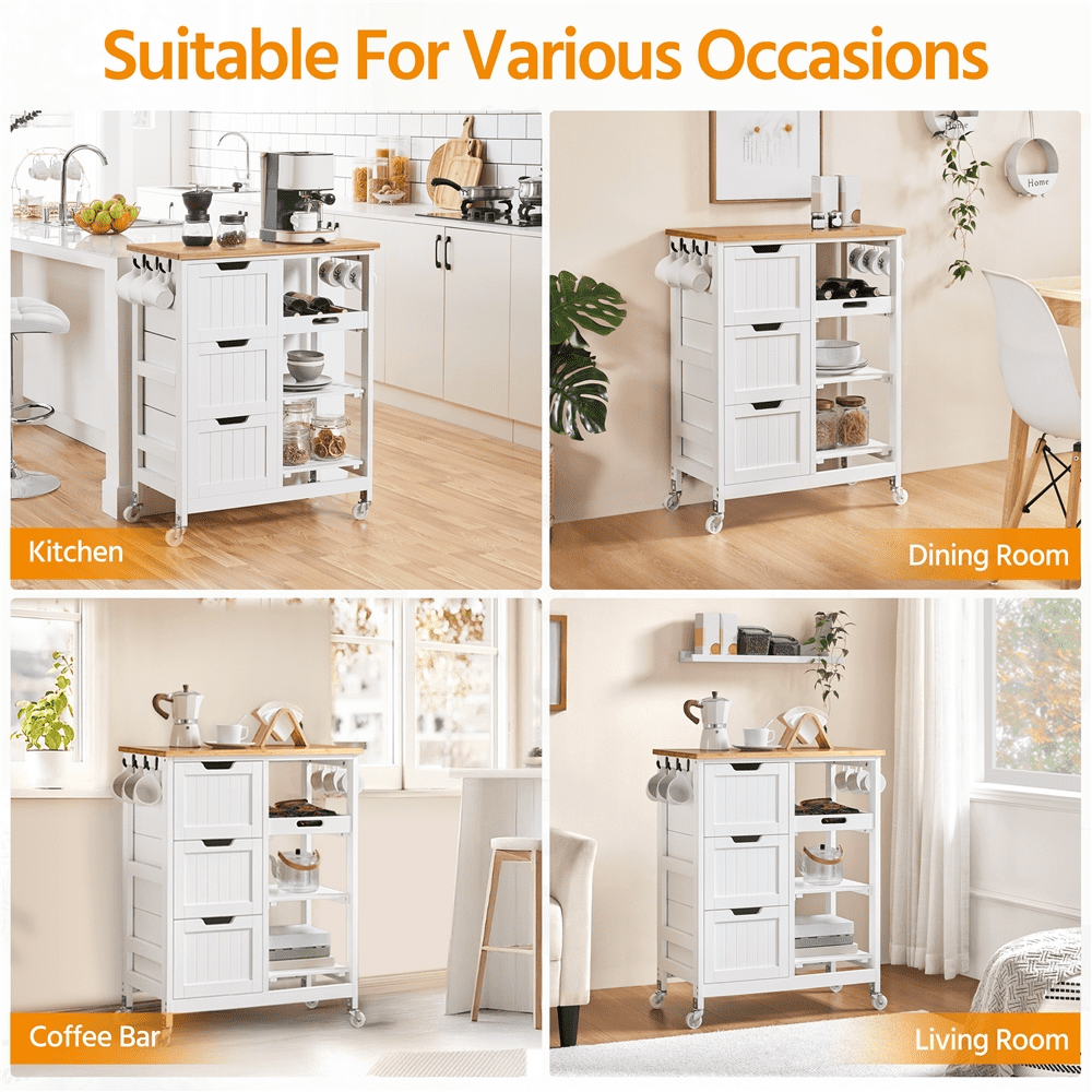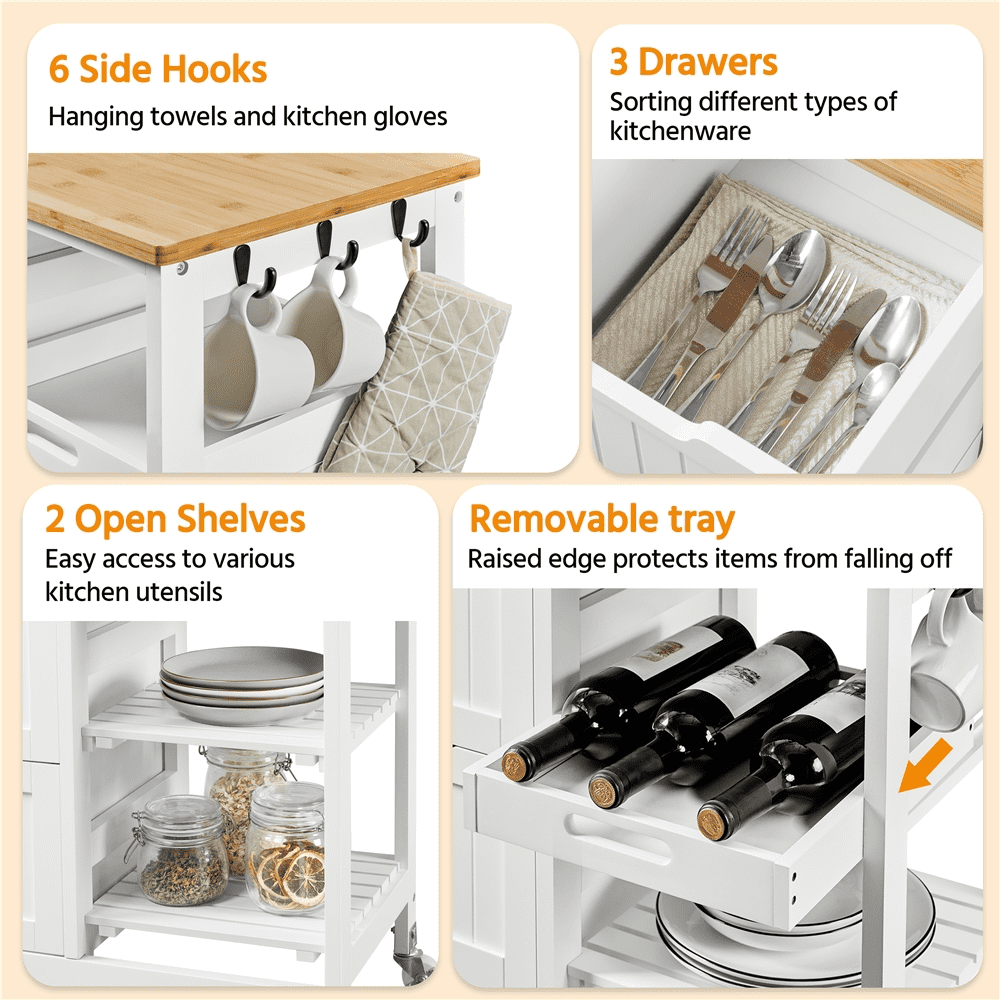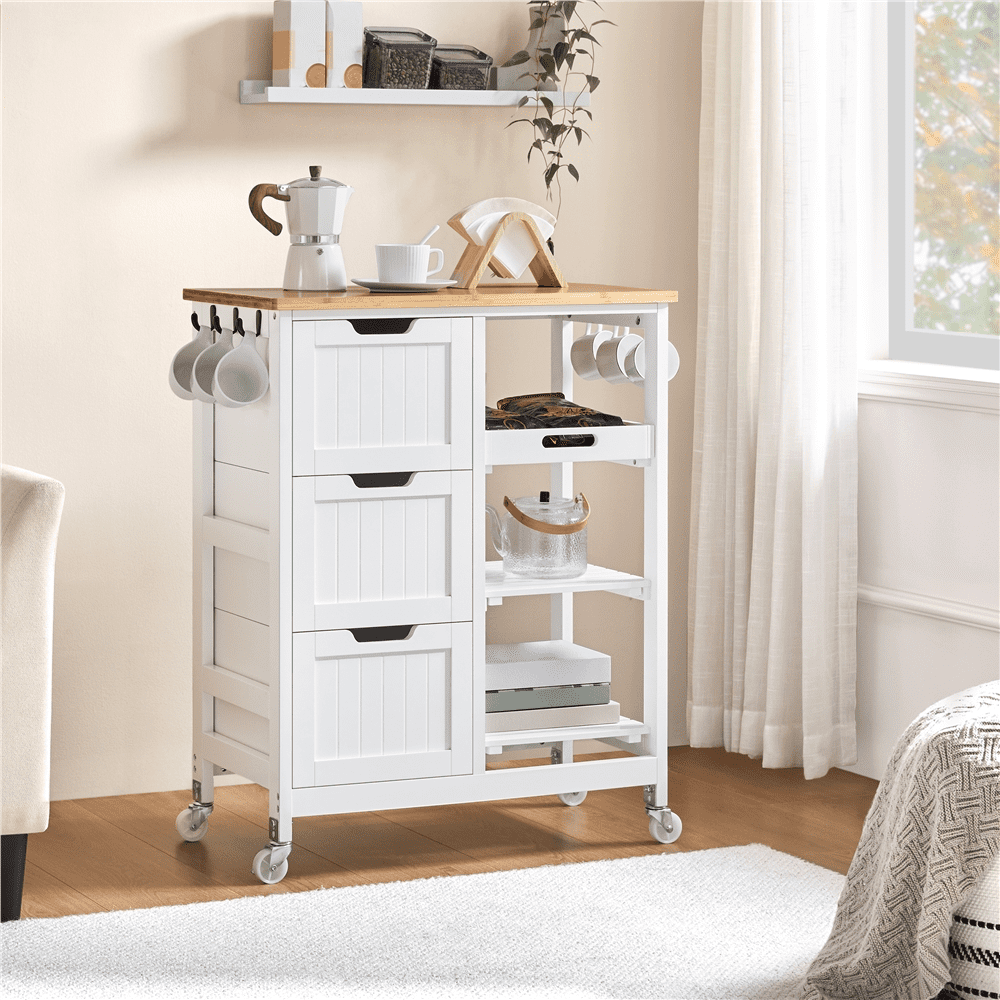 Kitchen trolley carts offer extra space for meal preparation which is of great significance for small kitchens. This 84.5cm/33” H utility kitchen cart is mainly made from CARB P2-compliant MDF and durable bamboo, which boasts durability and can totally hold up to 75kg/165lb. It consists of a bamboo top, three utility drawers and three removable shelves which provide ample room for storing a variety of everyday essentials. Stands on four universal wheels (2 with brakes), this rolling kitchen island boasts super convenient and effortless maneuverability and can lock into place if needed. Besides, due to the neutral color and classic design, the cart will not only help you finish the kitchen decluttering work but also add a touch of elegance to your home. Best of all, the first tray with built-in side handles can be removed easily and then converted to a small-sized serving tray or breakfast tray. This mobile kitchen island is absolutely a good choice for collecting pantry items without the clutter of your kitchen.